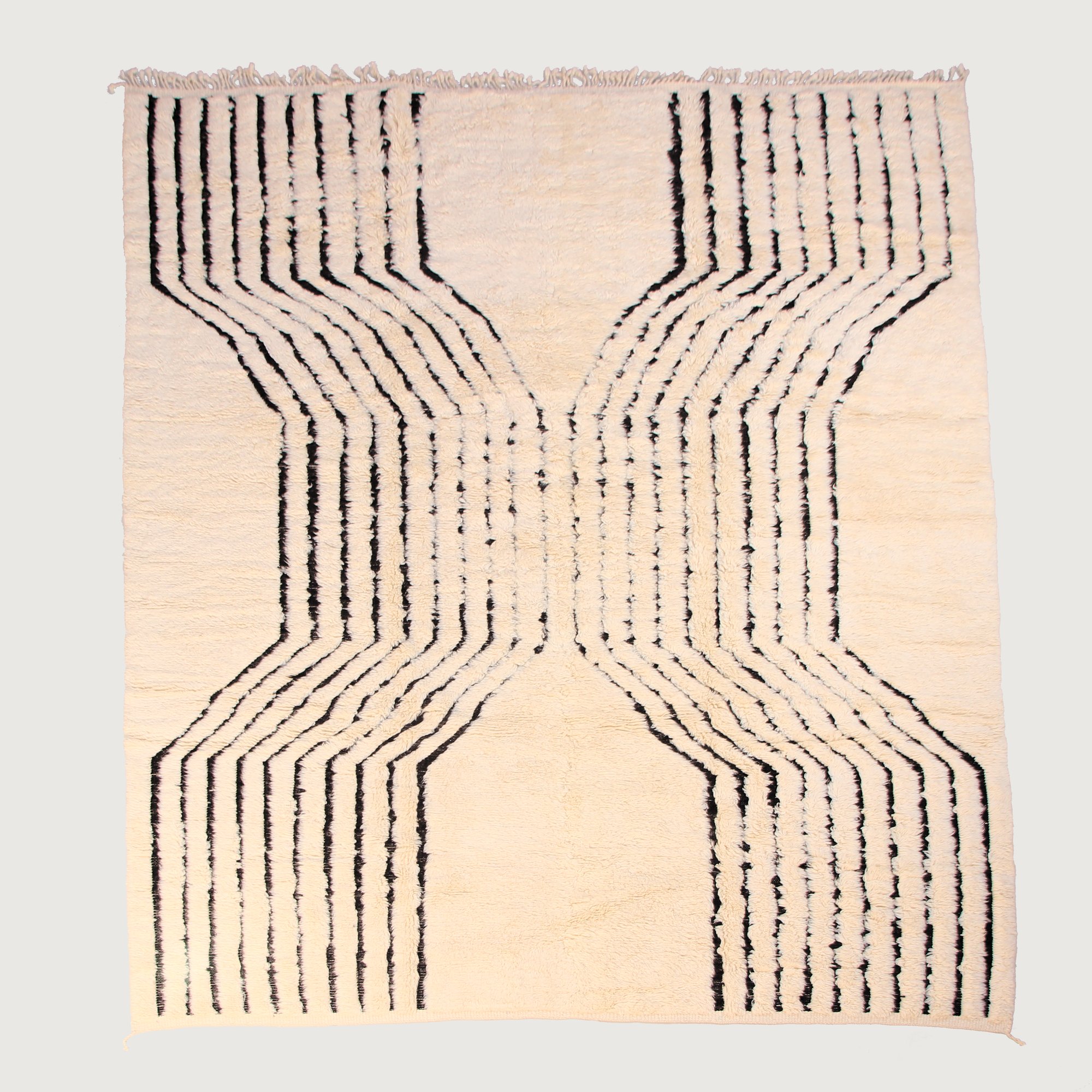 Handwoven in M’rirt, in the Middle Atlas Mountains of Morocco, this striking Beni Ourain rug features a bold symmetrical composition of flowing vertical lines that converge at the center, creating a powerful sculptural X-like formation.