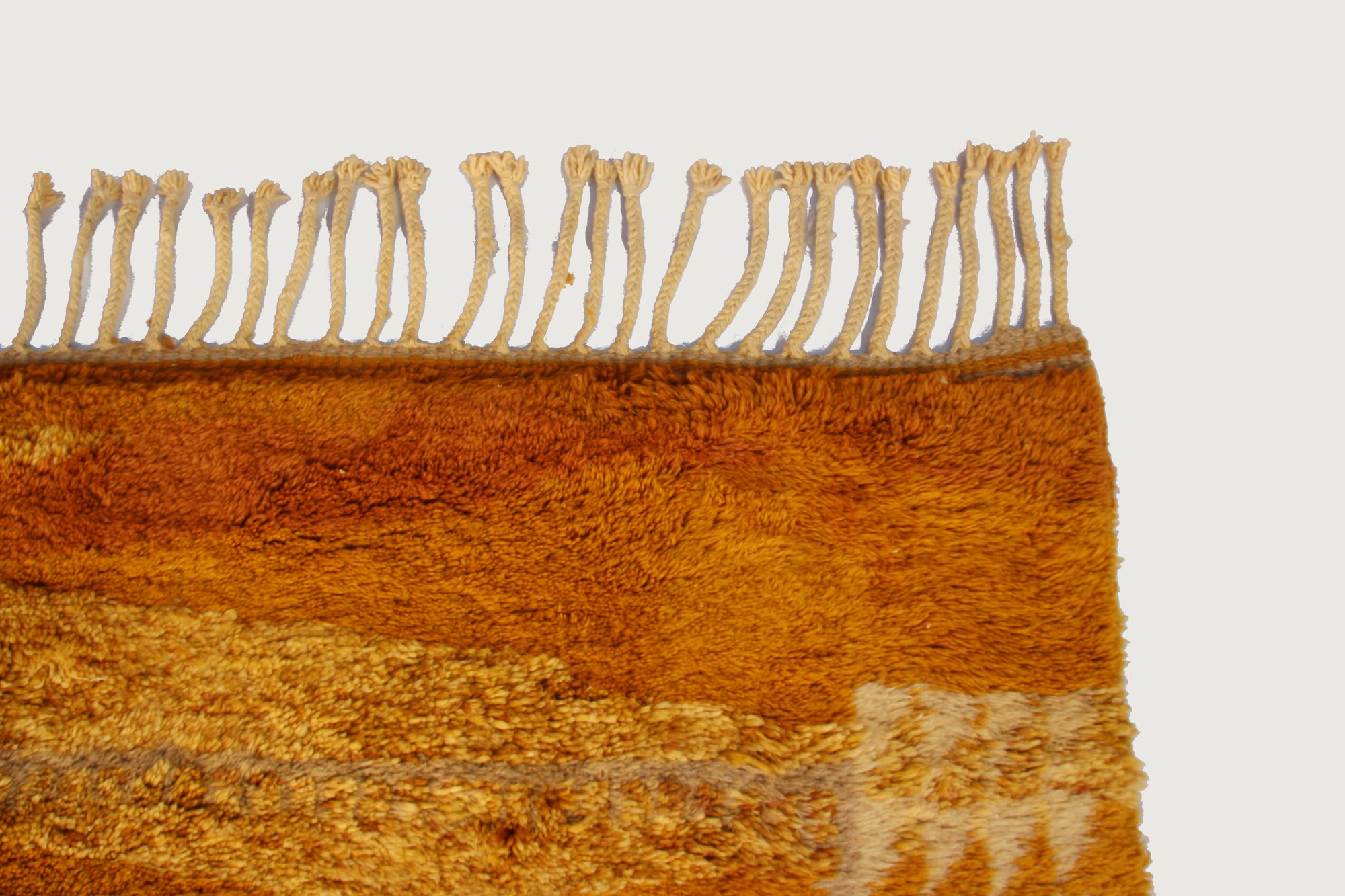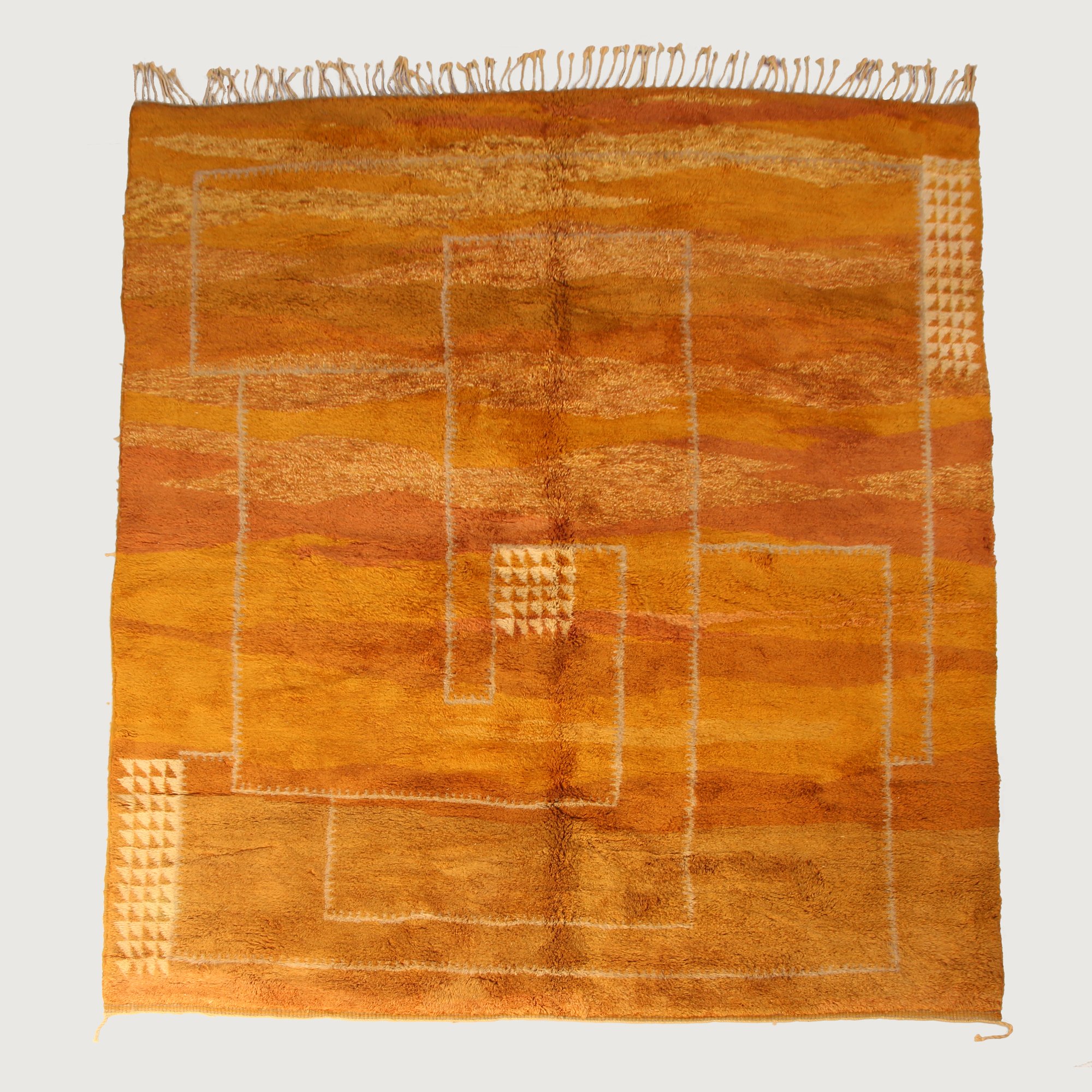 Handwoven in M’rirt, in the Middle Atlas Mountains of Morocco, this striking large-scale Beni M’rirt rug features a warm amber and ochre palette layered with subtle tonal variations. The surface evokes natural desert landscapes, with soft horizontal shading that adds depth and movement.