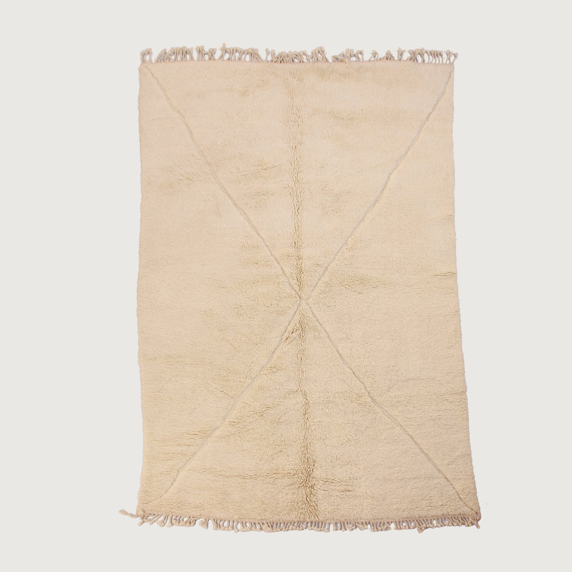 Handwoven in M’rirt, in the Middle Atlas Mountains of Morocco, this minimalist Beni Ourain rug embodies quiet elegance and timeless simplicity. Its soft natural ivory field is enhanced by a subtle raised diamond (lozenge) structure that forms a large, balanced X motif across the surface.