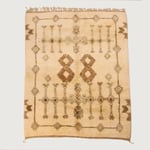 Handwoven in M’rirt, in the Middle Atlas Mountains of Morocco, this elegant Beni M’rirt rug showcases a beautifully balanced Amazigh geometric composition set against a soft ivory wool field. Symmetrical motifs, diamond medallions, and delicate linear elements create a harmonious architectural layout framed by a refined border.