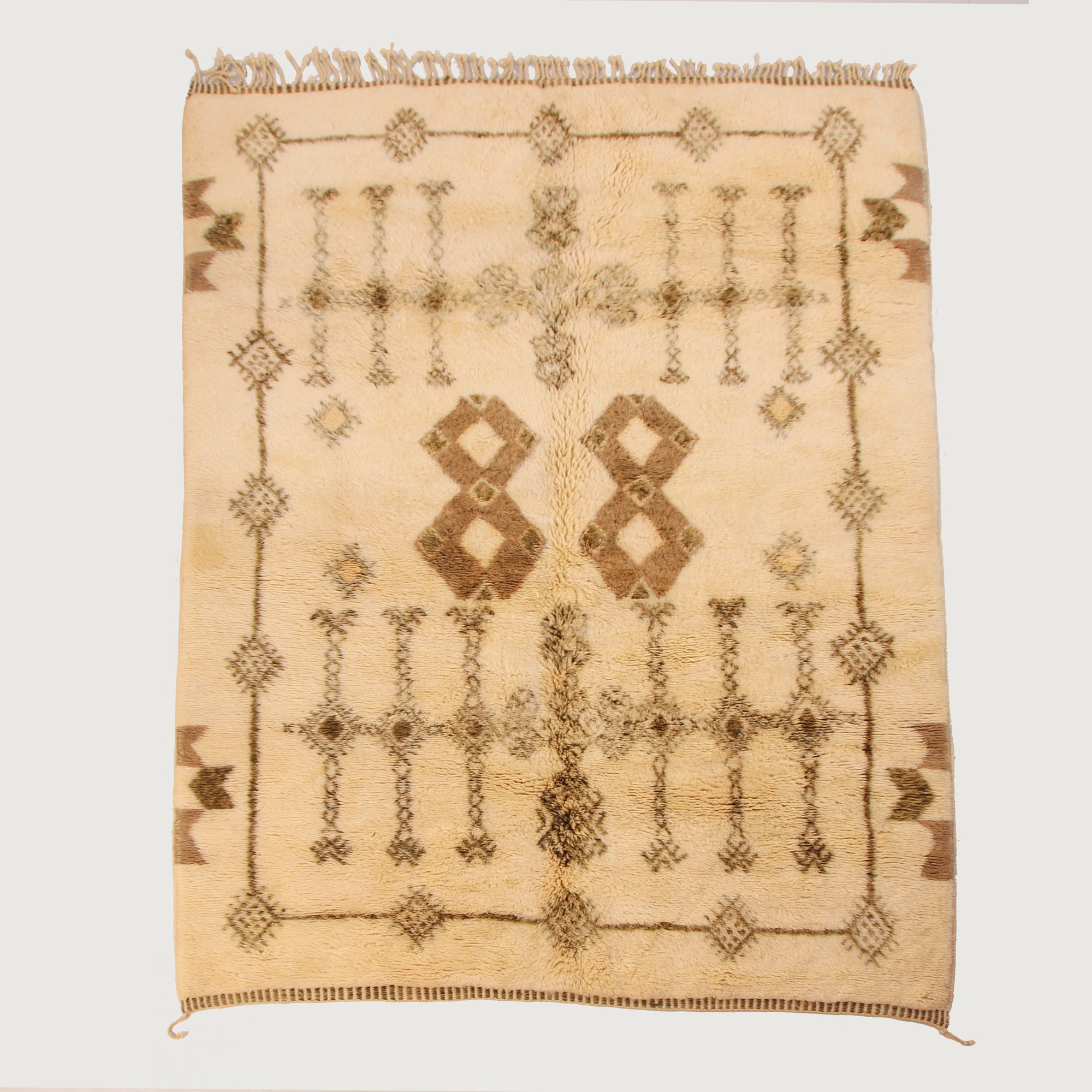 The warm tones of taupe, caramel, and soft brown contrast gently with the natural ivory base, giving the piece depth while maintaining a timeless and versatile aesthetic. The central paired diamond forms anchor the design, symbolizing unity and protection within traditional Amazigh weaving heritage.