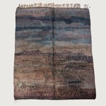 Handwoven in M’rirt, in the Middle Atlas Mountains of Morocco, this exceptional Beni M’rirt rug features a dramatic striated composition in deep earth and mineral tones. Layered bands of charcoal, bronze, ash, taupe, and muted teal create a landscape-like surface with remarkable depth and movement.