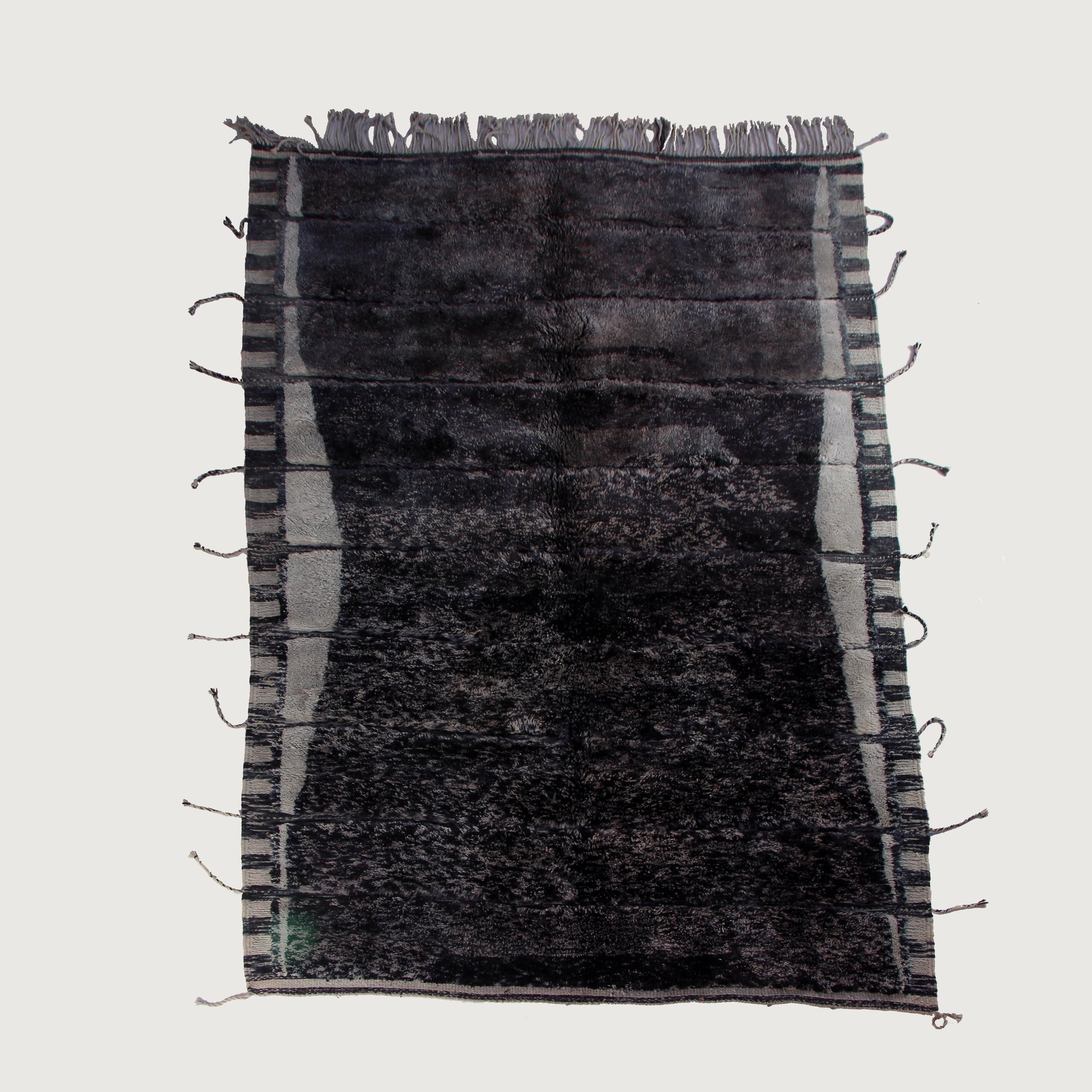 Handwoven in M’rirt, in the Middle Atlas Mountains of Morocco, this Beni M’rirt rug features a rich deep charcoal field framed by subtle linear side borders. The minimalist composition and bold dark tone create a striking modern statement while preserving the softness and refinement that define Beni M’rirt craftsmanship.
