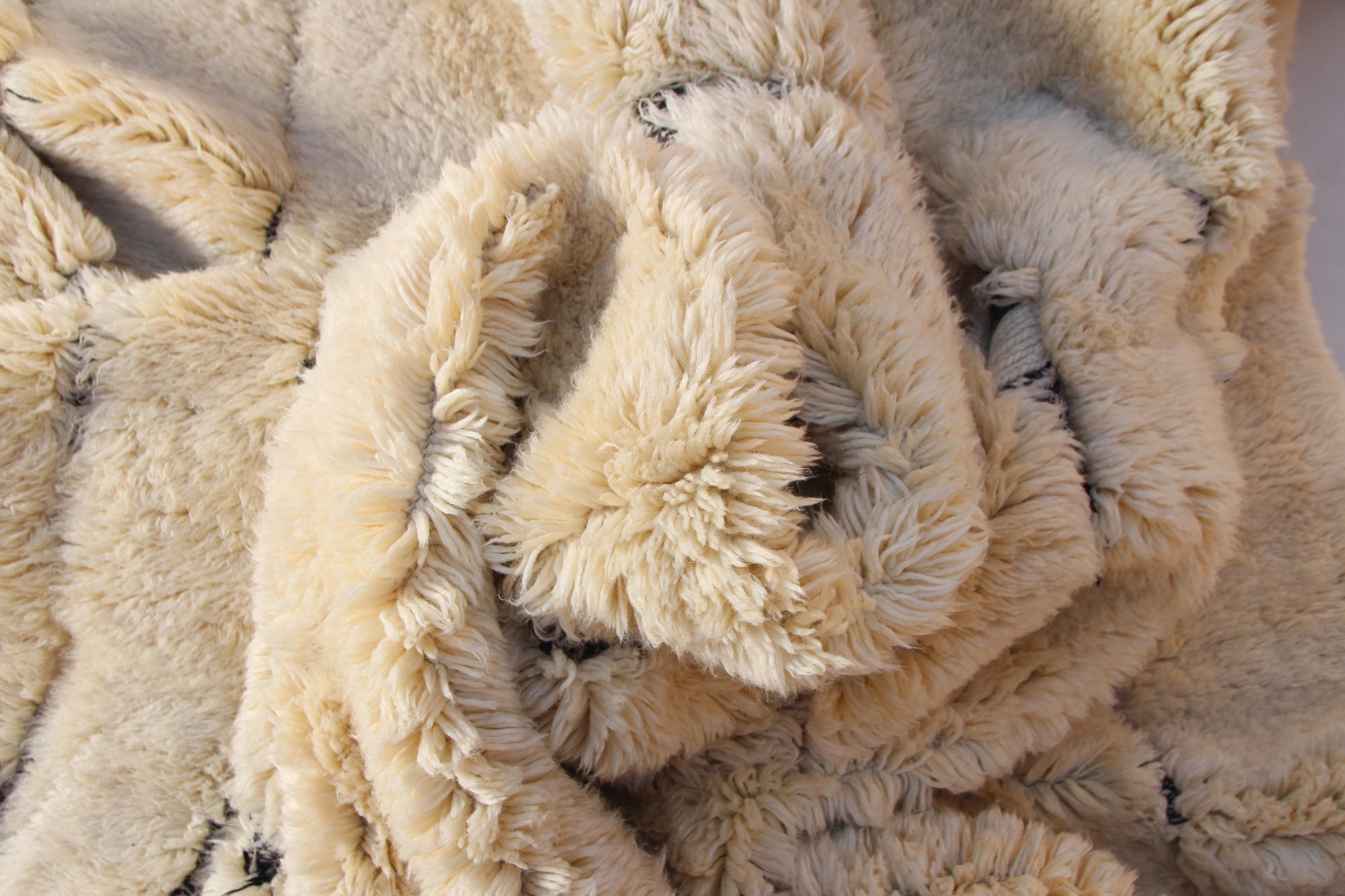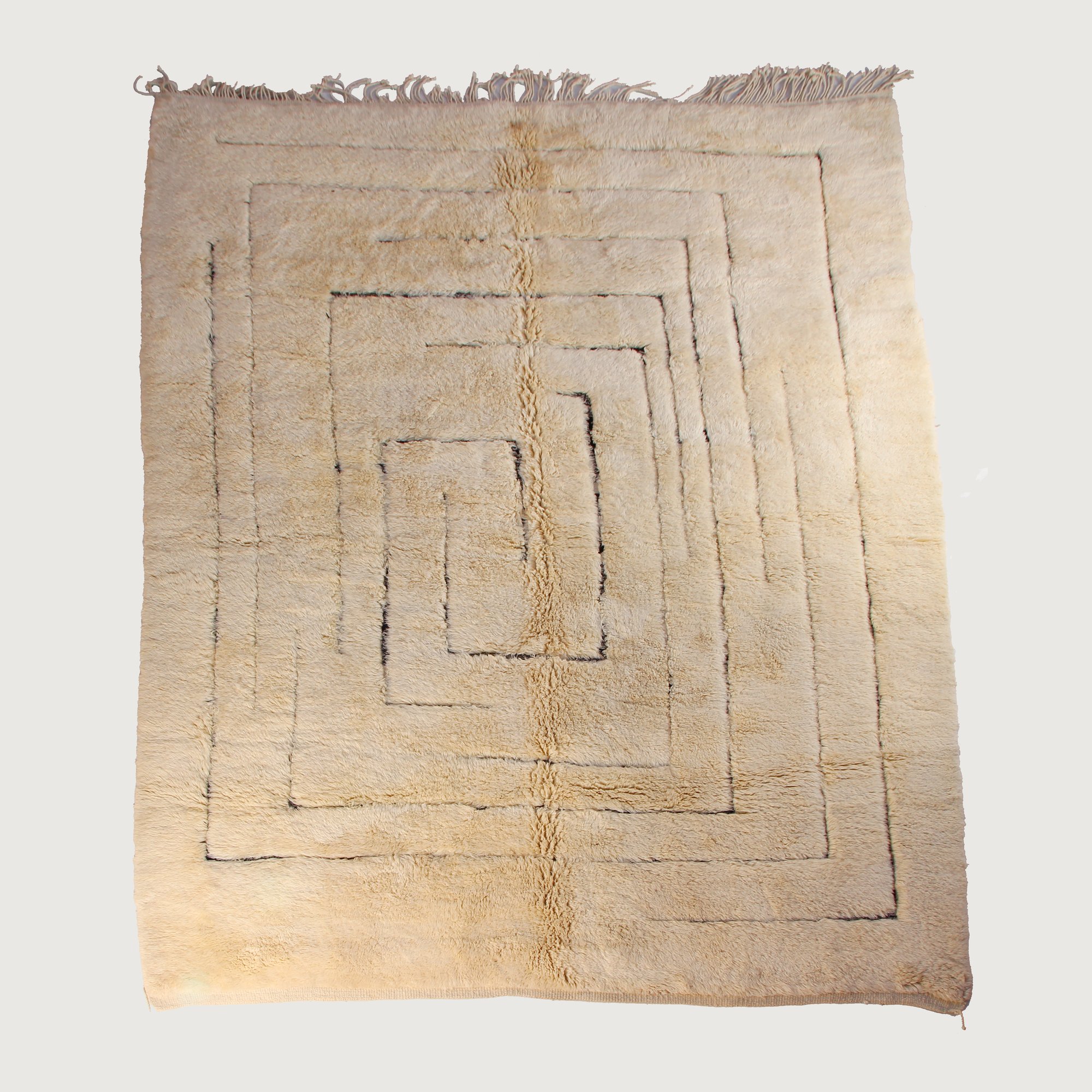 Handwoven in M’rirt, in the Atlas Mountains of Morocco, this Beni Ourain rug features a soft cream wool base with subtle geometric linework forming a layered, concentric pattern. The minimalist composition and neutral tones create a calm, modern aesthetic while preserving traditional Moroccan craftsmanship.