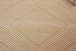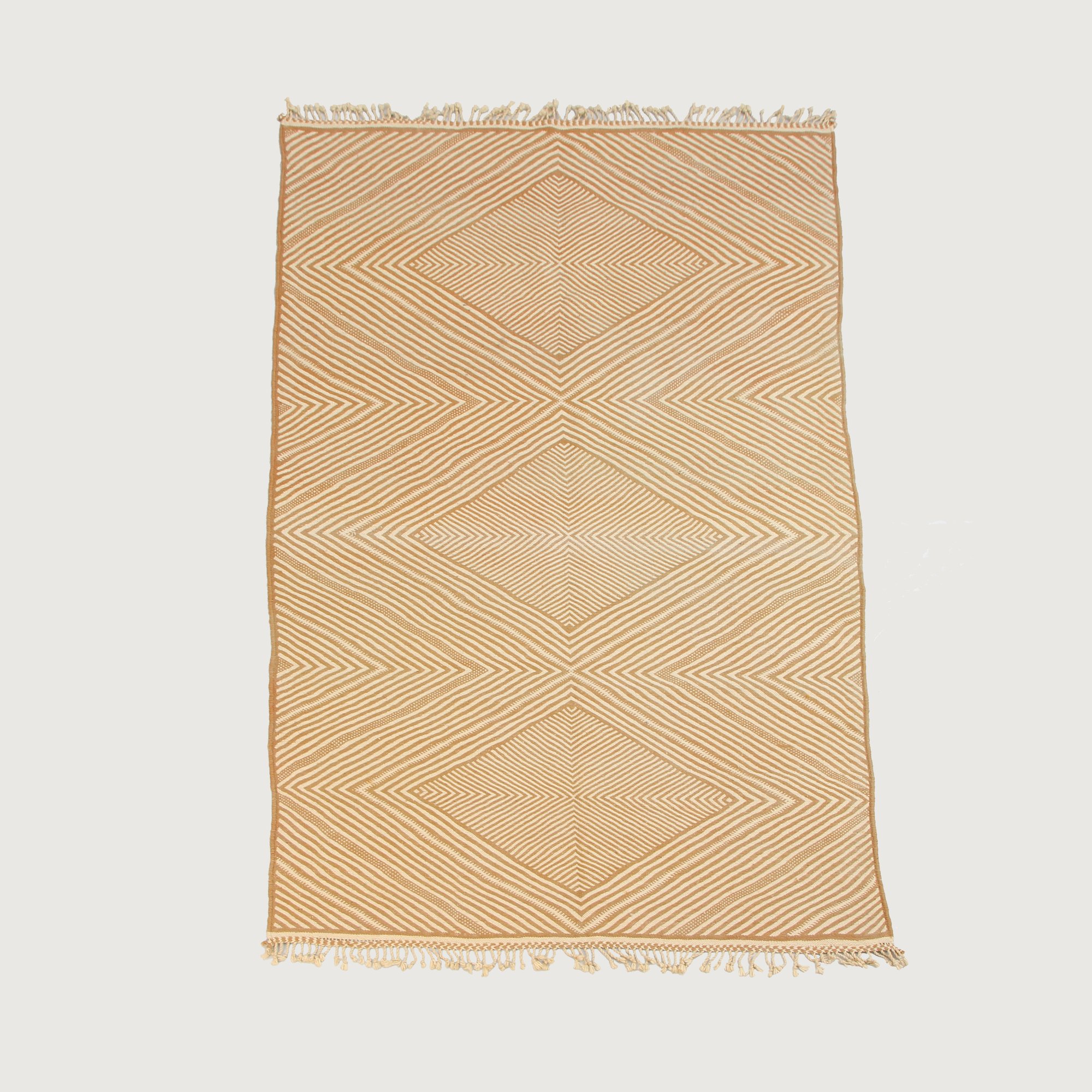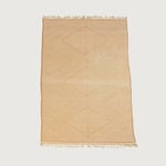 Handwoven in M’rirt, in the Middle Atlas Mountains of Morocco, this Kilim rug showcases a refined geometric diamond pattern accented with delicate linear detailing. Its warm sand and natural ivory tones create a soft, timeless aesthetic that complements modern, minimalist, and contemporary interiors.