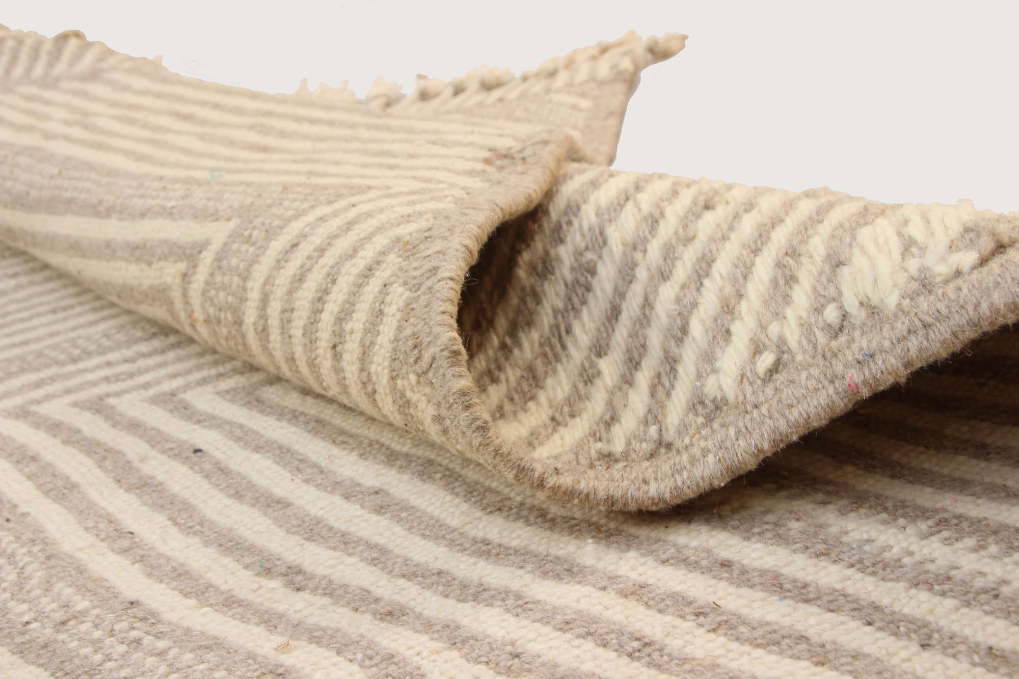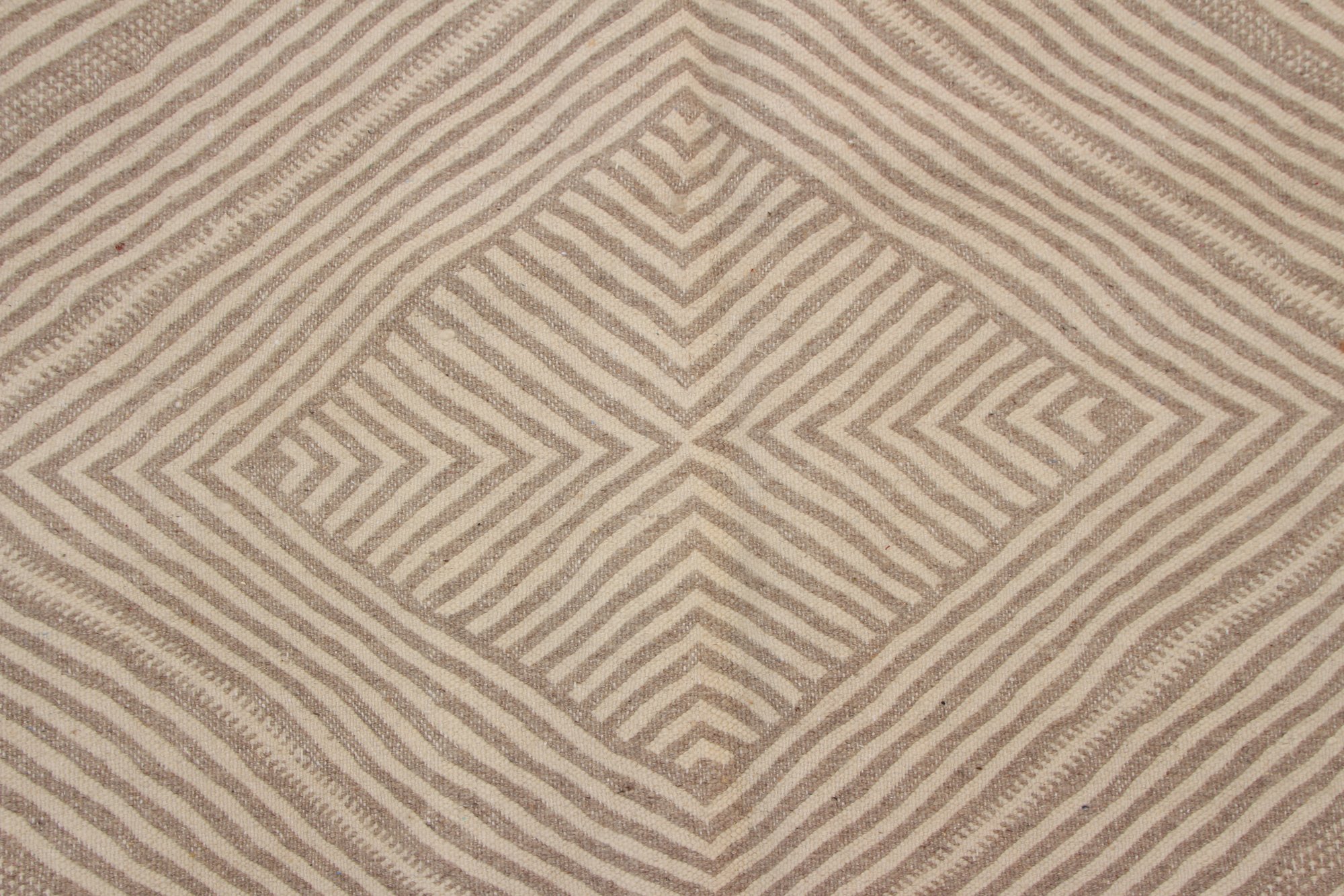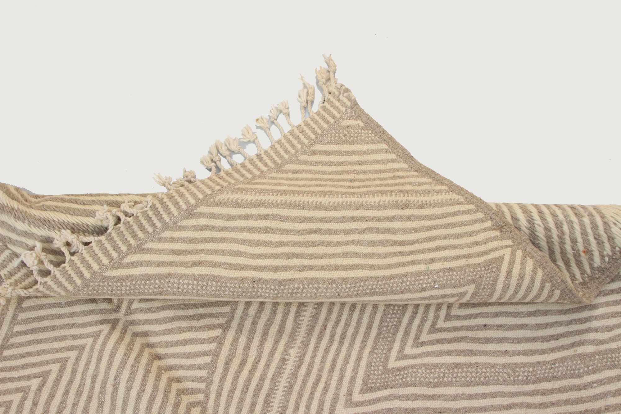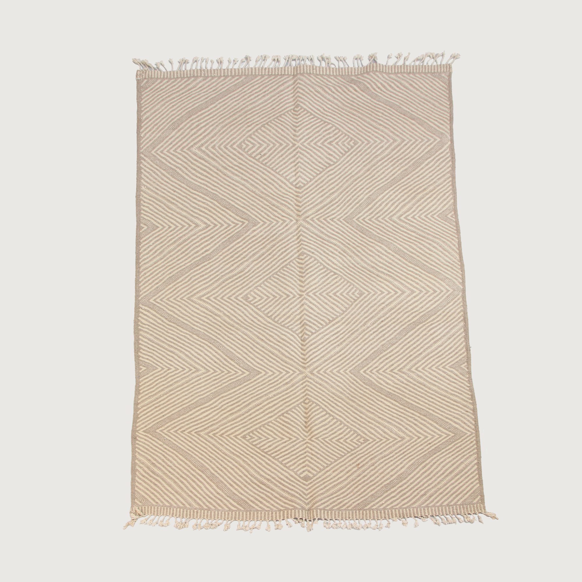 Handwoven in M’rirt, in the heart of the Middle Atlas Mountains of Morocco, this Kilim rug reflects generations of Amazigh craftsmanship and refined textile tradition. Its soft ivory and warm sand tones are layered with delicate linear diamond motifs, creating subtle depth and gentle movement across the surface.