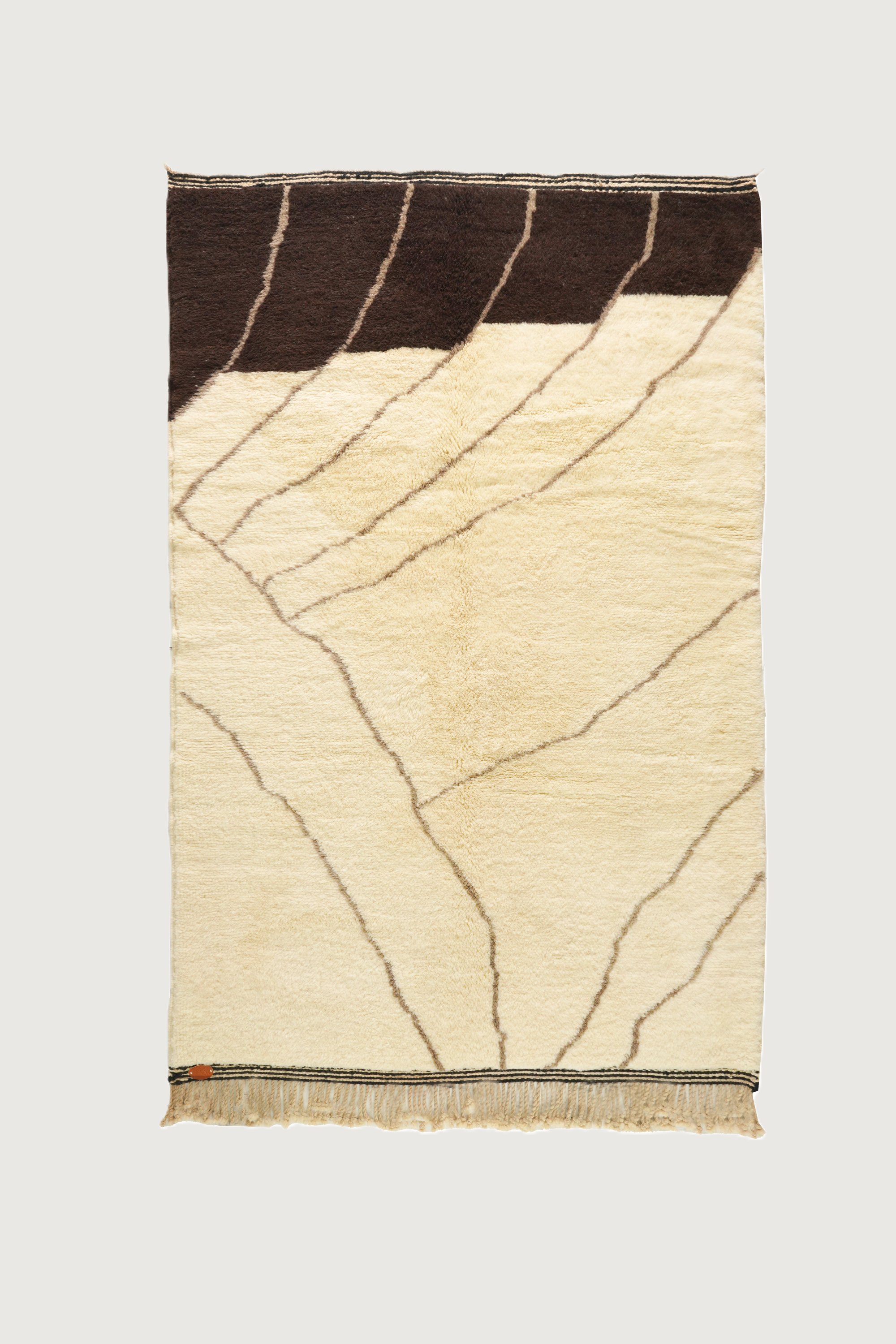 Crafted from 100% pure wool, it offers a soft texture and long-lasting durability. The seamless transition between beige and brown tones, enhanced by contrasting lines, creates a harmonious and visually engaging design.