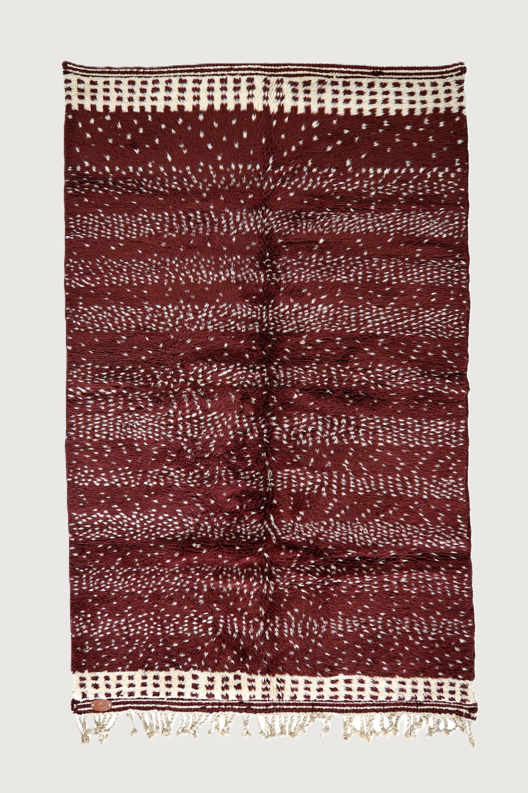 Crafted with precision by skilled artisans in Morocco's High Mountain Atlas region, this handwoven rug is made from 100% Pure Wool, ensuring a luxurious feel underfoot. The use of natural dyes enhances the deep burgundy hue, while the white dots add an element of freshness to the overall aesthetic.