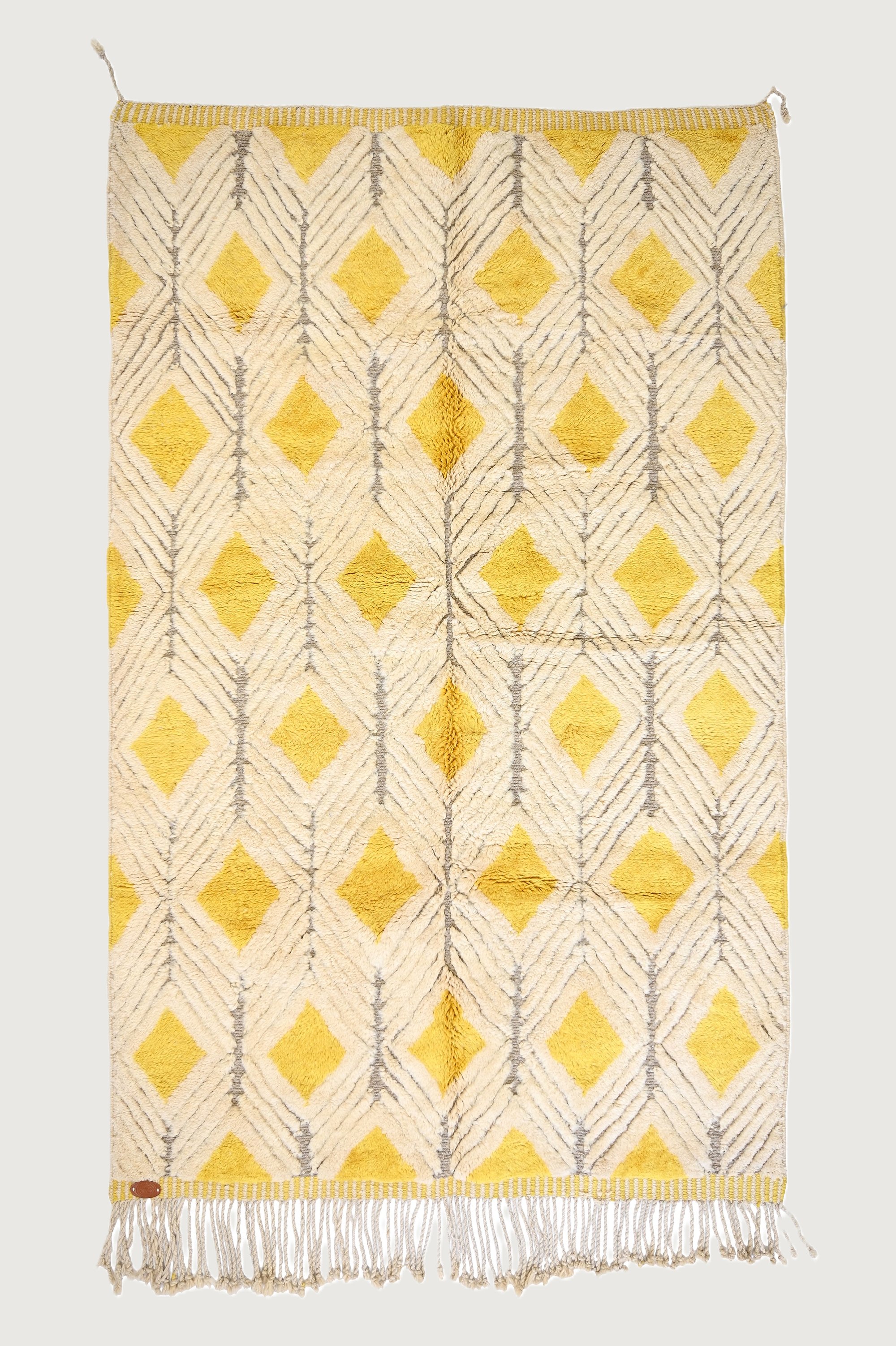 Made from 100% Pure Wool, it features beige tones enhanced with yellow diamond motifs and delicate lines, creating a warm and luminous effect.