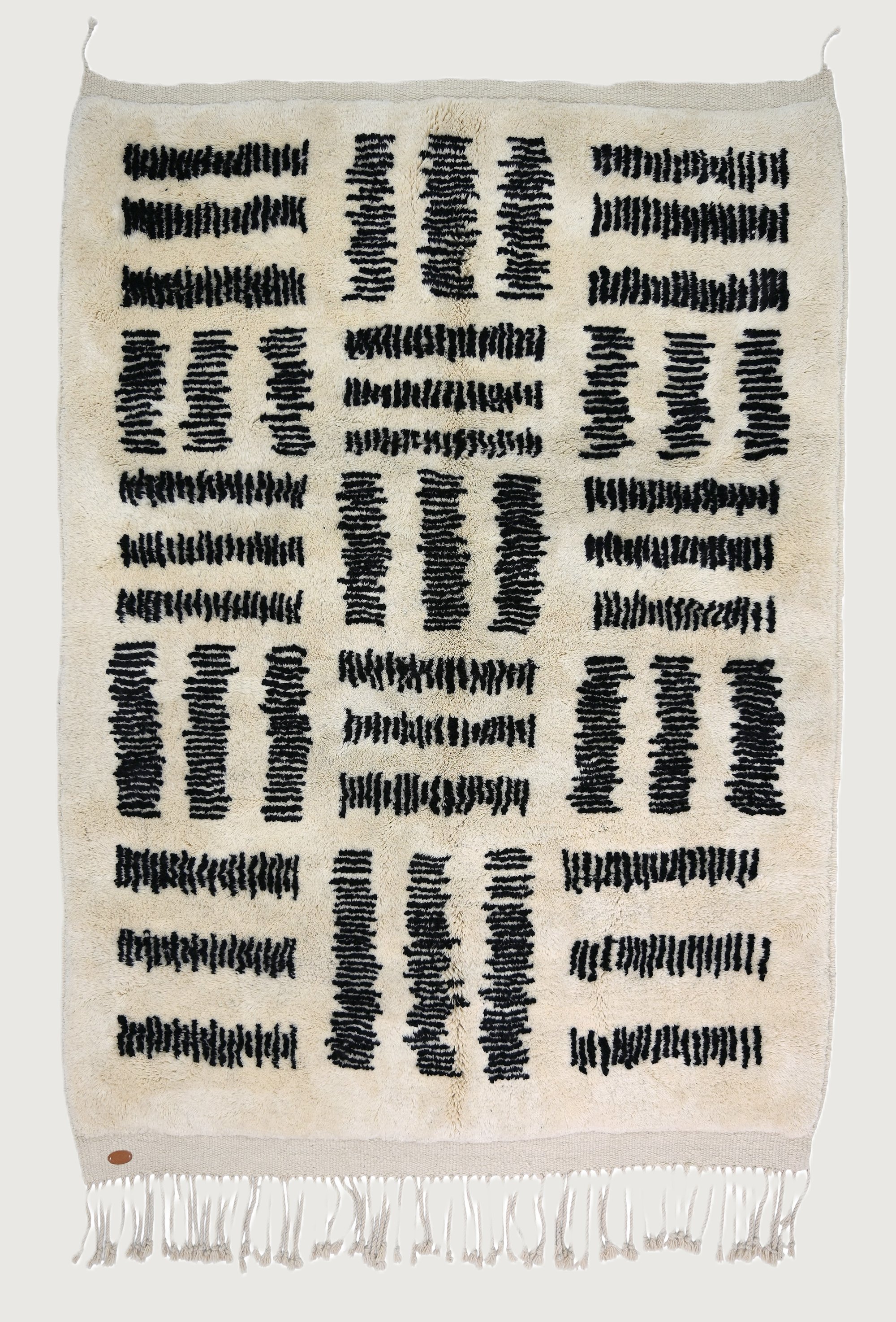 Crafted from 100% pure wool, it offers a soft, luxurious texture enhanced by natural dyes. The design features a mesmerizing composition of black stitches, creating a subtle yet captivating pattern that adds character and visual interest. Each rug is a unique, one-of-a-kind creation, blending timeless artistry with understated elegance.