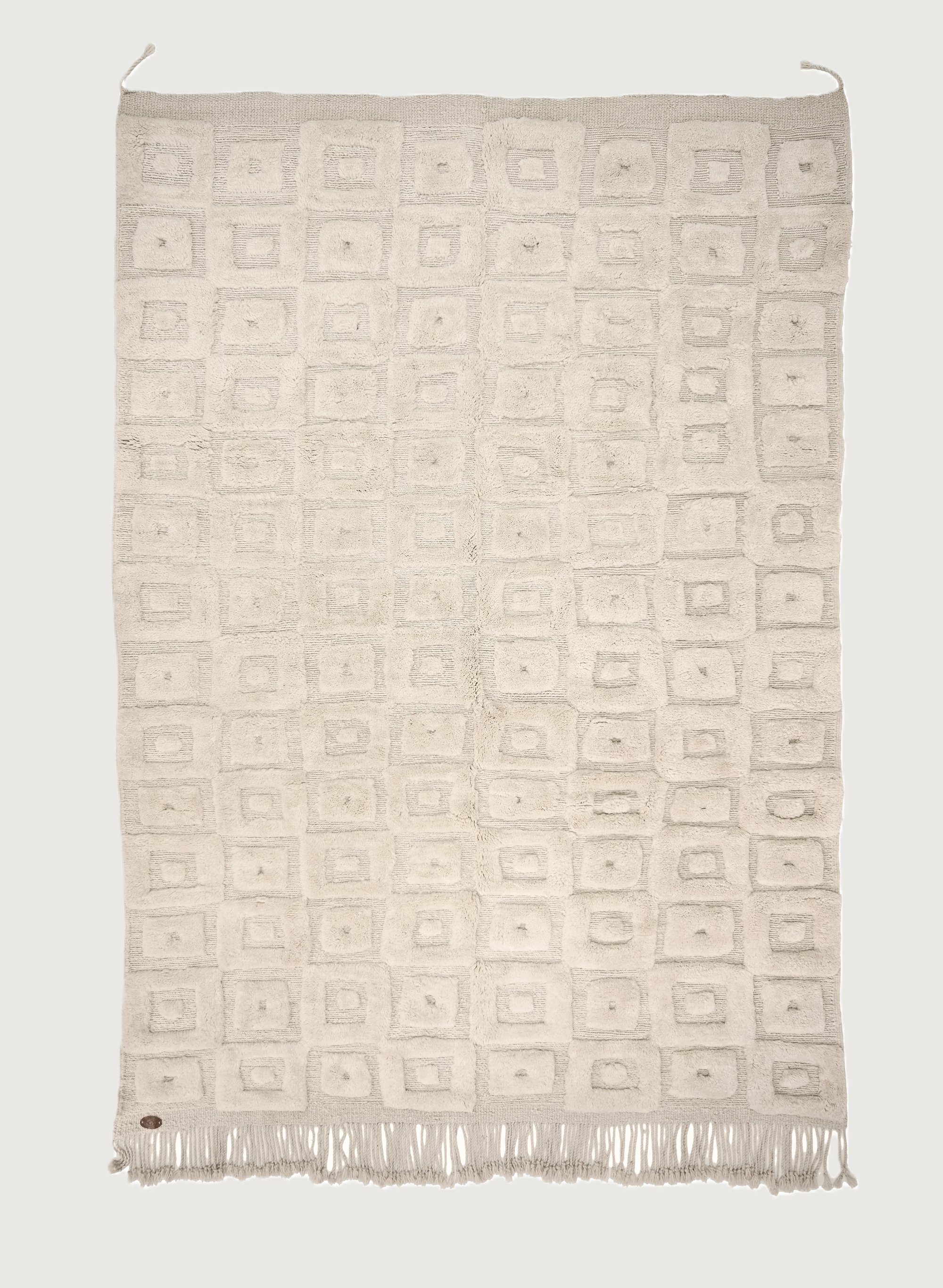 Crafted from 100% pure wool, it offers a soft, luxurious texture enhanced by natural dyes. The design features a pristine ivory backdrop adorned with a pattern of imperfect square forms, creating subtle depth and visual rhythm. Each rug is a unique, one-of-a-kind creation, showcasing the authenticity of handmade artistry.