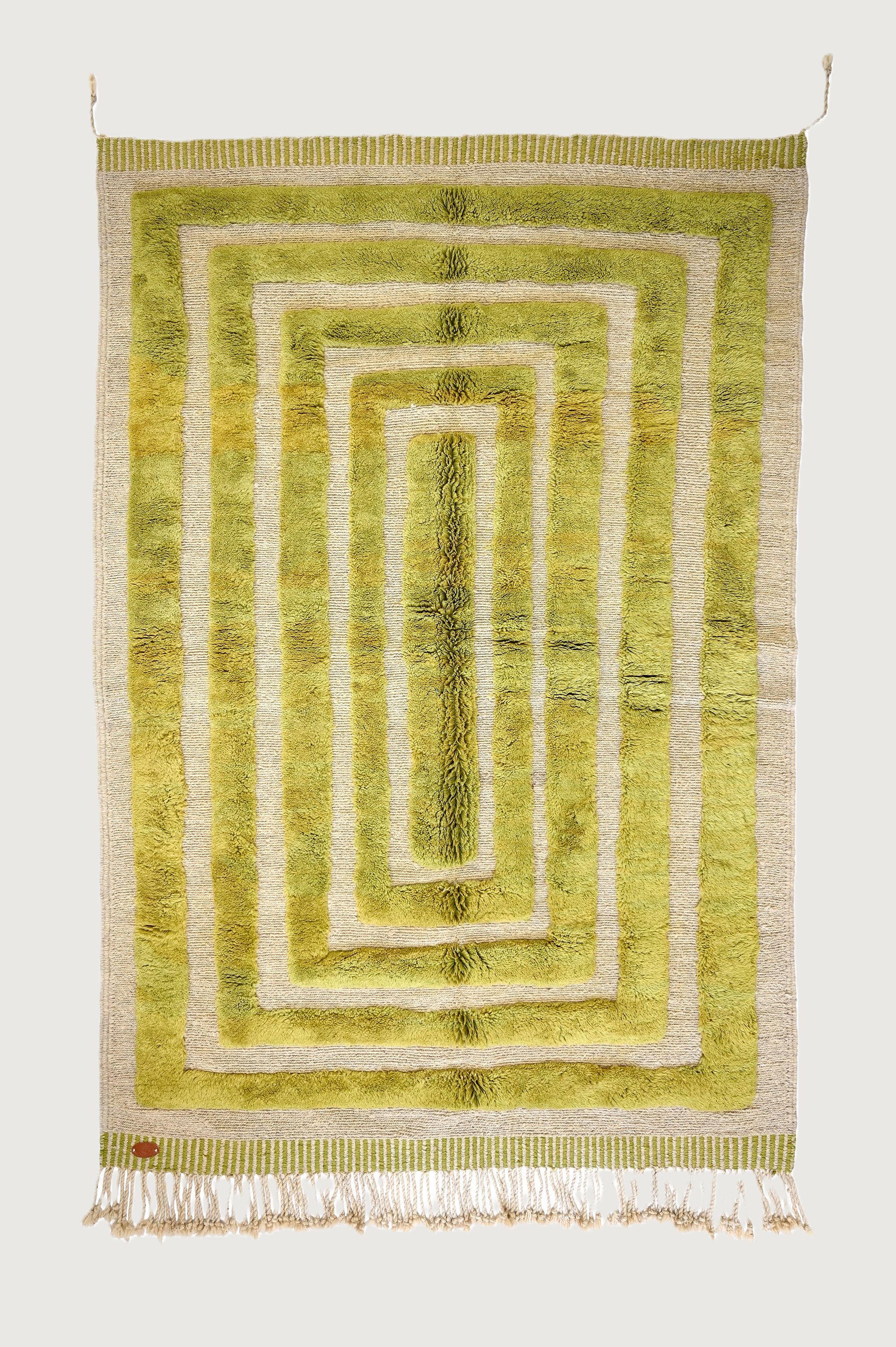 The "Chromatic Green Moroccan Rug" showcases a captivating interplay of green and beige rectangular patterns.