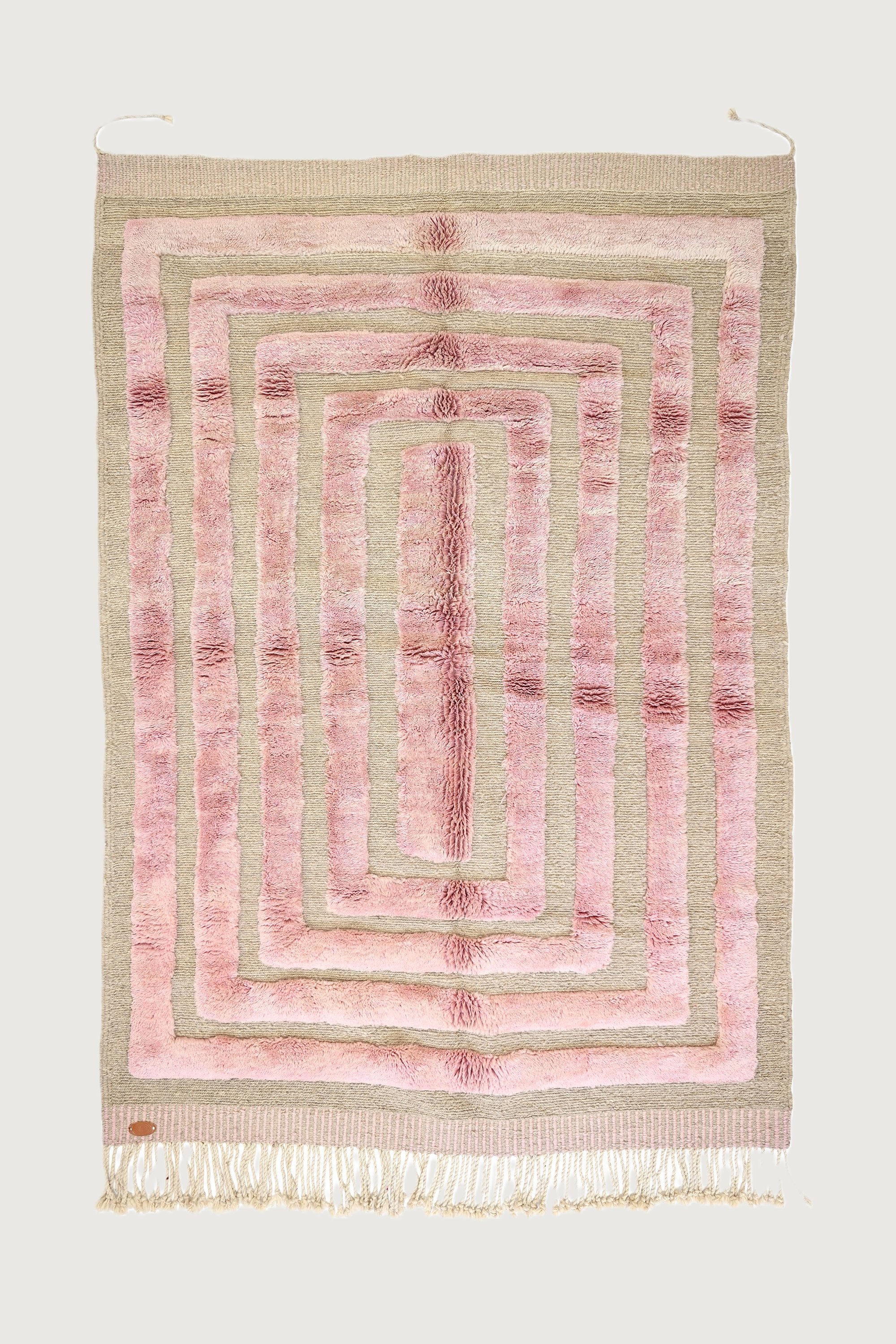 Soft and elegant, this rug features pink and beige geometric patterns that bring warmth and sophistication.
