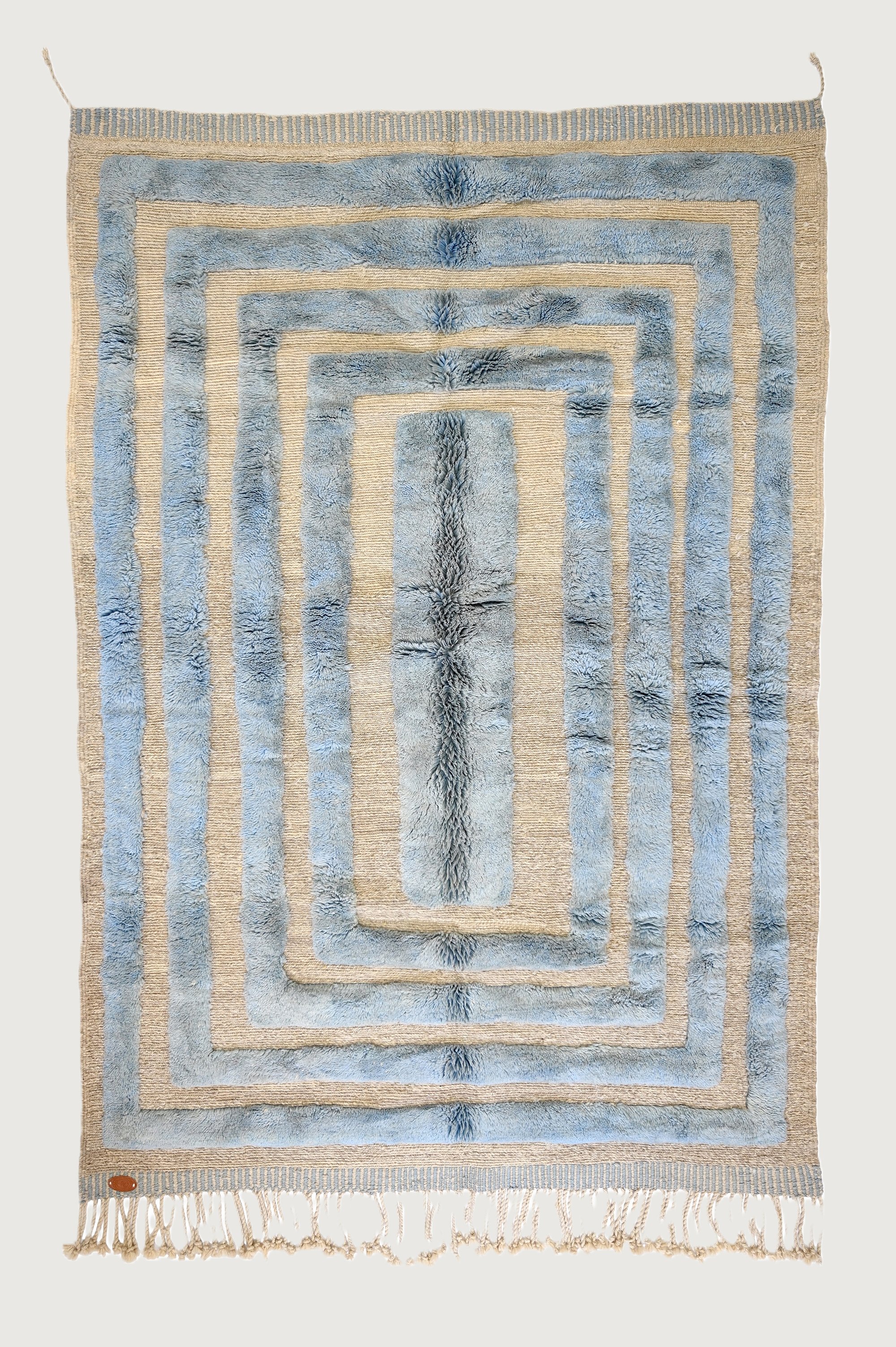 A bold composition of blue and beige rectangular patterns creates a striking visual balance.
