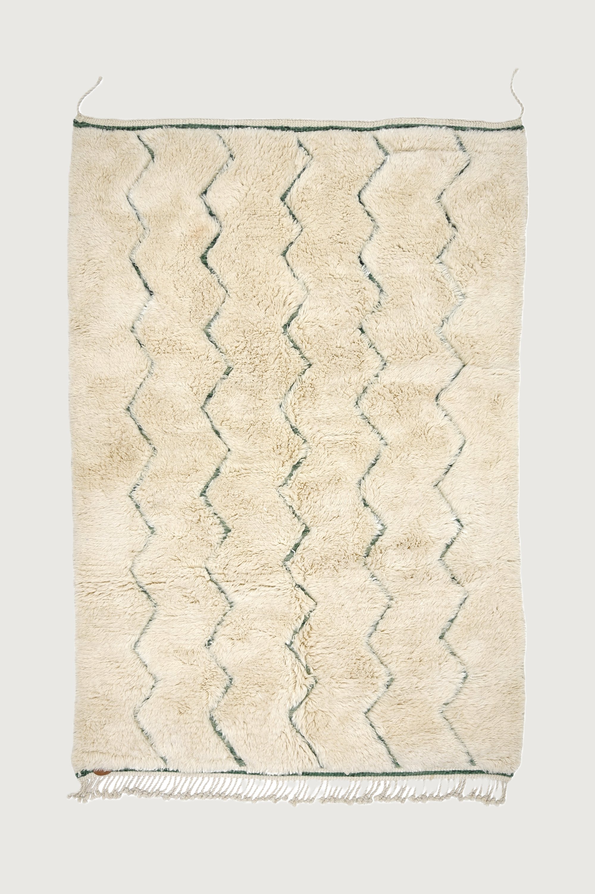 Crafted from 100% pure wool, it offers a soft, durable texture enhanced by natural dyes. The design features a pristine white background highlighted with intricate emerald green zigzag patterns, creating a bold yet balanced visual rhythm. Each rug is a unique, one-of-a-kind creation, shaped by traditional handweaving techniques passed down through generations.