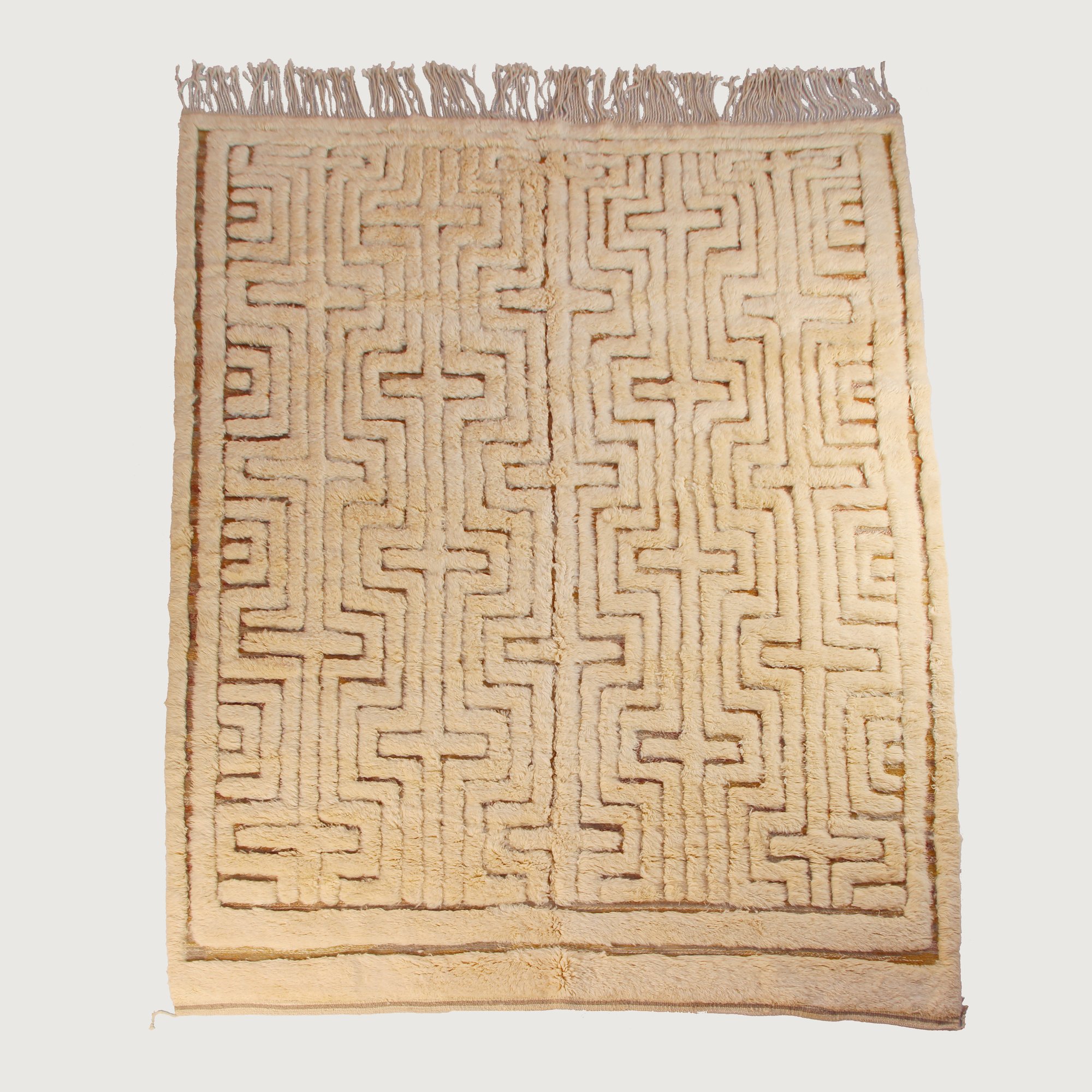 Handwoven in M’rirt in Morocco’s Middle Atlas Mountains, this refined Beni M’rirt rug features a sculpted labyrinth-style geometric pattern arranged in a rhythmic vertical layout.