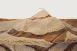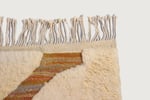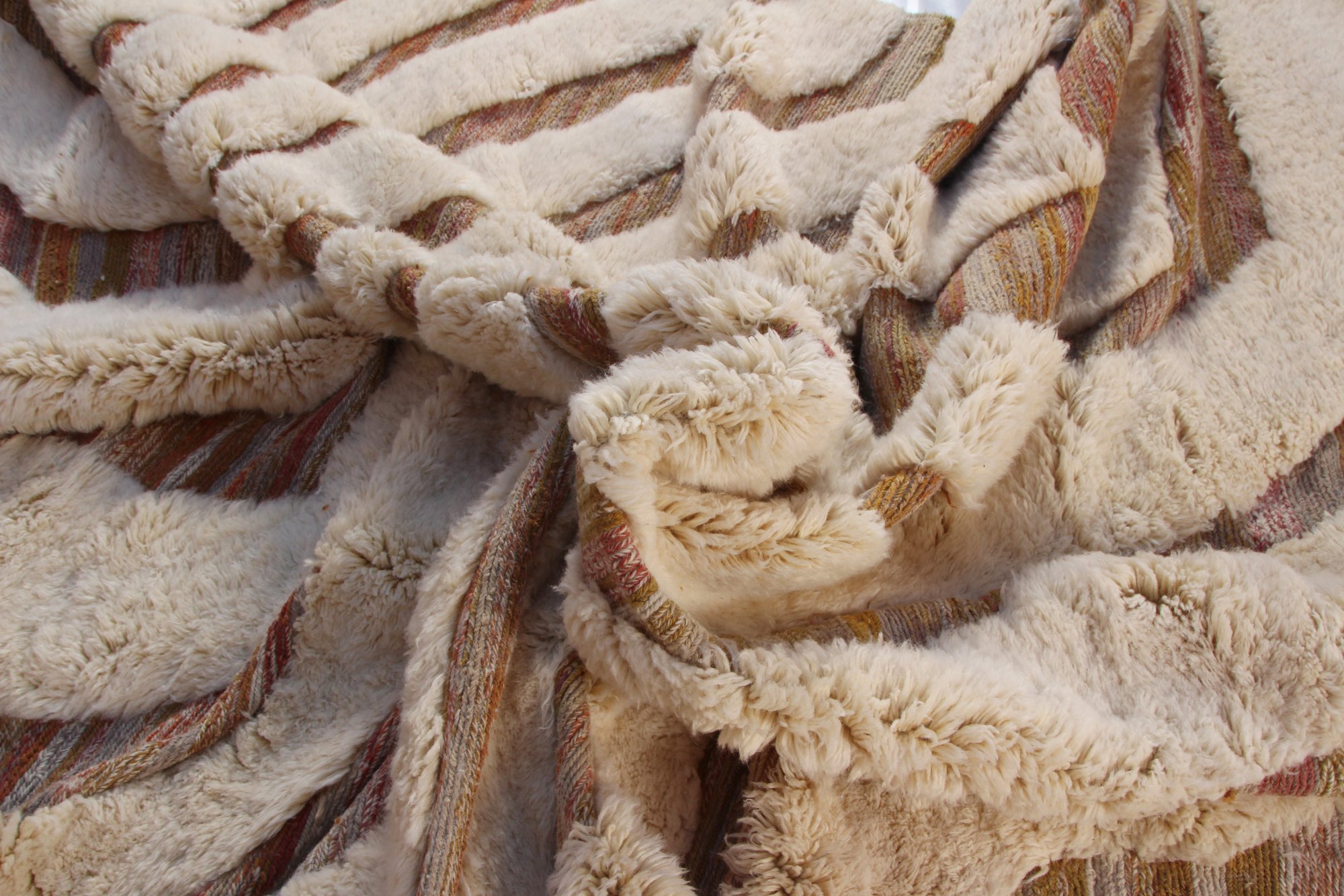 Soft sculpted ivory wool forms raised curved bands across a warm earthy base with subtle striations in terracotta, sand, and muted brown. The contrast between plush pile and flatwoven texture creates depth and tactile richness.