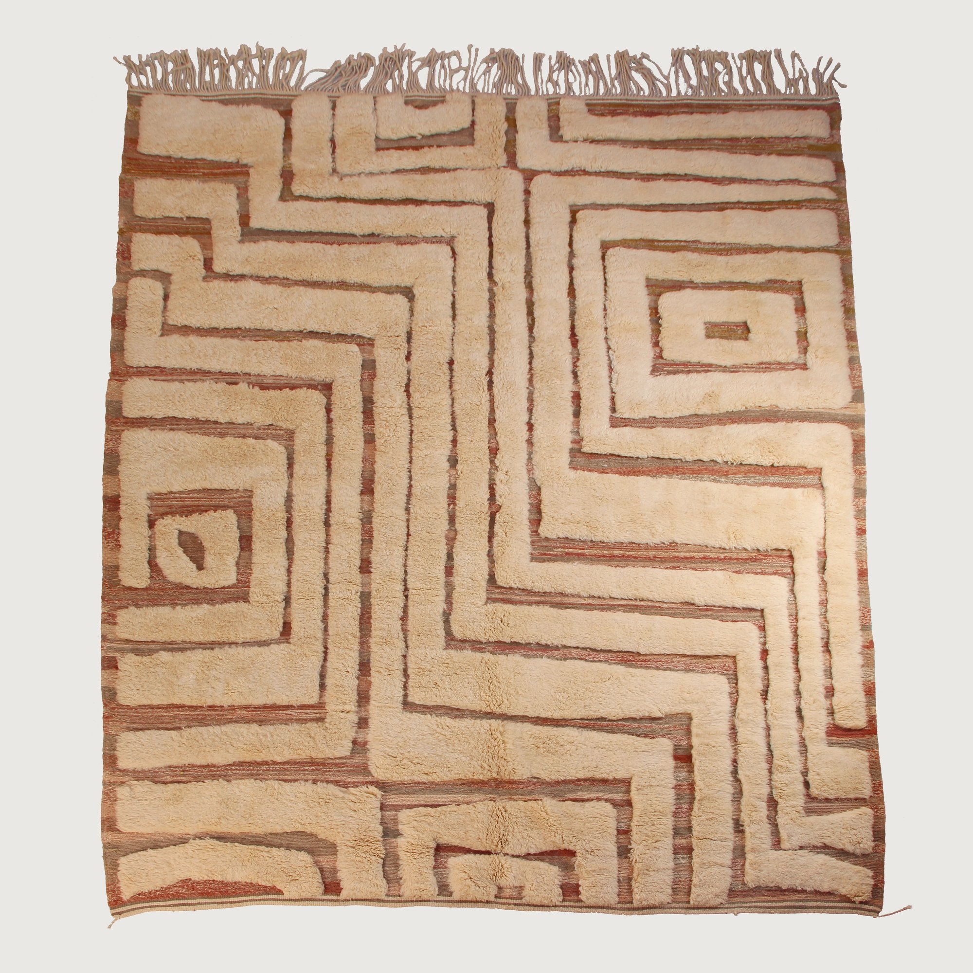 Handwoven in M’rirt in Morocco’s Middle Atlas Mountains, this bold Beni M’rirt rug features a labyrinth-inspired geometric design with strong angular lines and layered symmetry.
