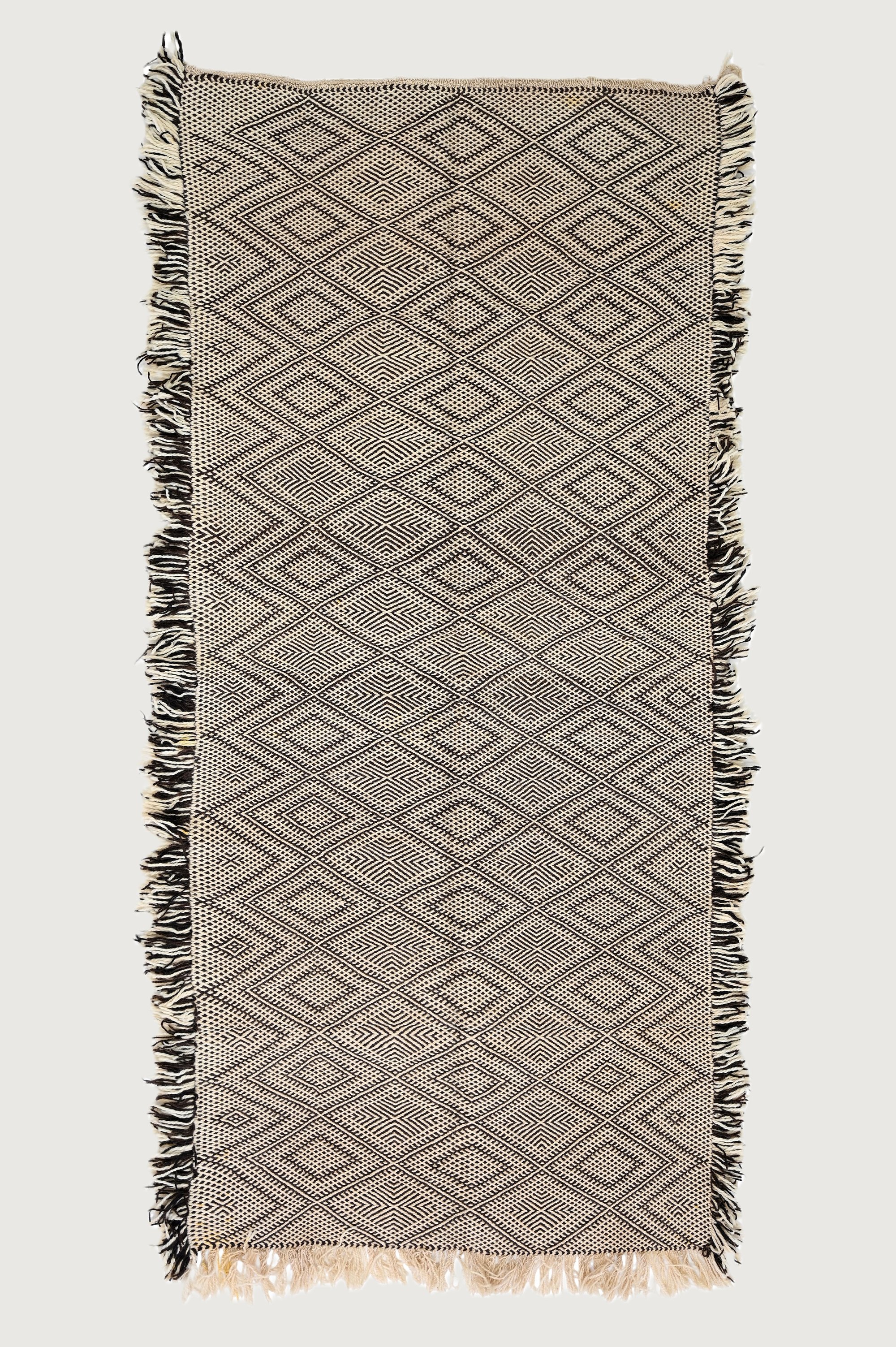 Transform your living space with the Marrakech Treasures Taznakht Rug, featuring exquisite beige and black geometric patterns. This exceptional handwoven rug is crafted from 100% wool and hails from Morocco's High Mountain Atlas region. It is a one-of-a-kind masterpiece that adds an elegant touch to your home decor.