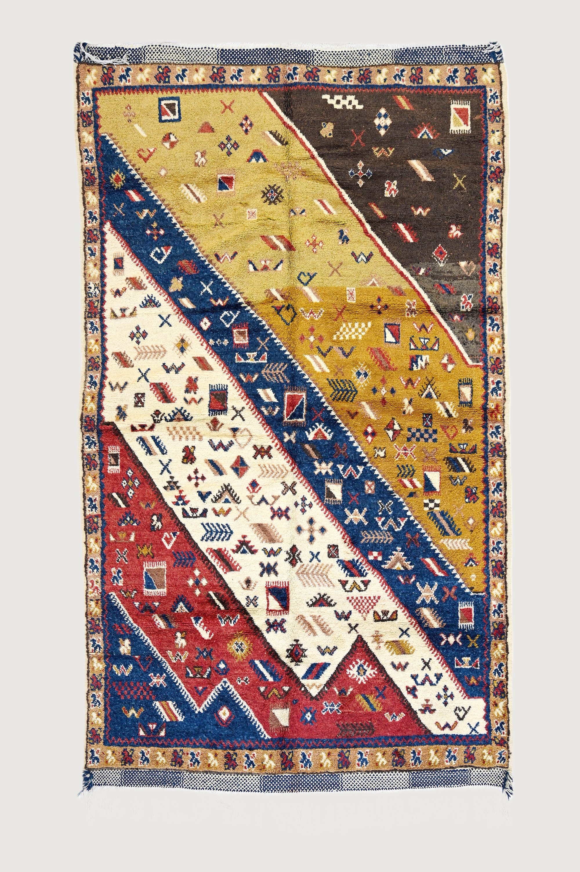 Discover the craftsmanship of this handwoven Taznakht rug, made from 100% wool and inspired by the High Atlas Mountains. It features earthy tones and geometric diagonal patterns enhanced by natural dyes.