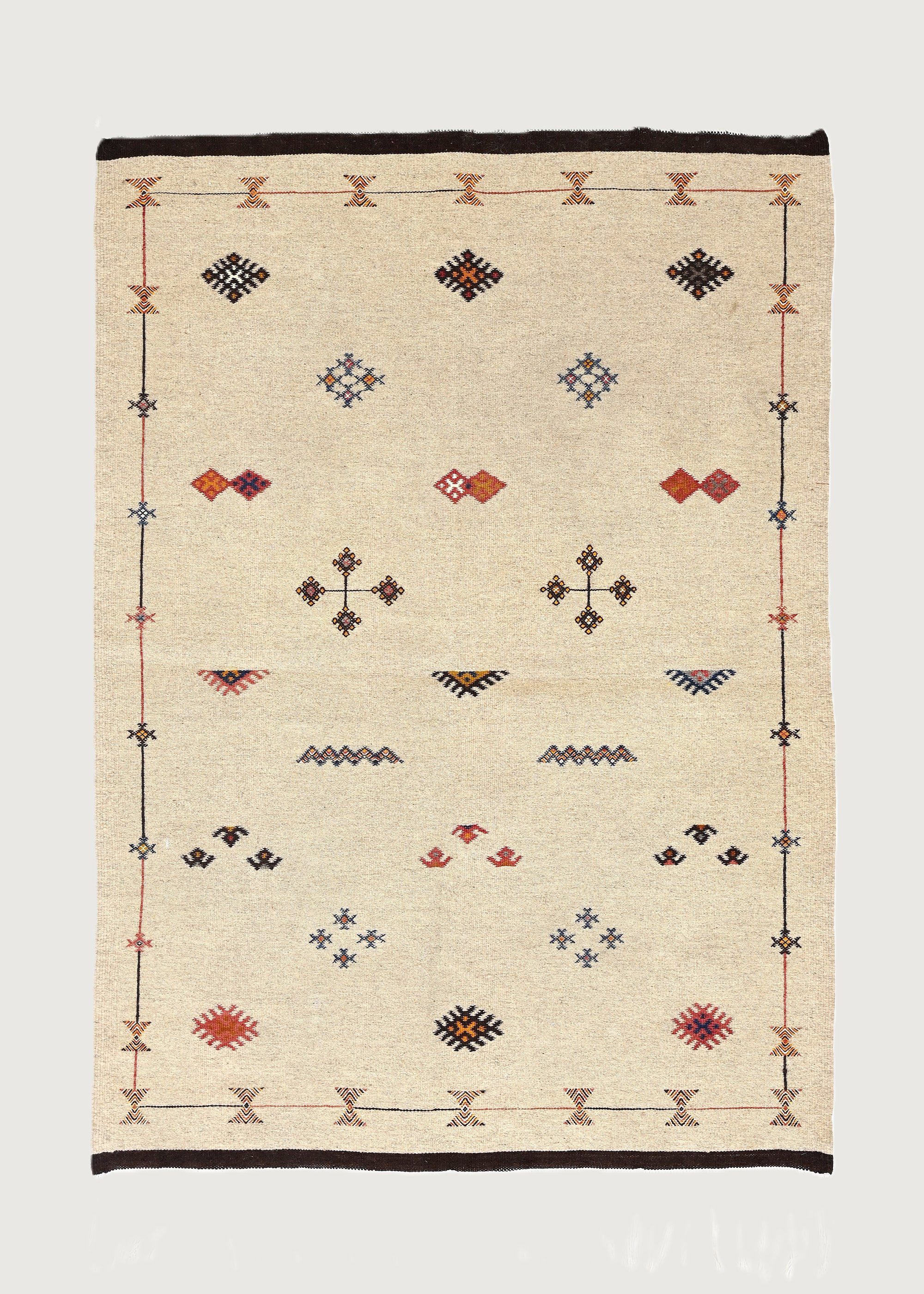 The Nomadic Canvas Scatter Pattern Taznakht rug is inspired by wandering traditions and symbolic storytelling. Handwoven from wool, it features scattered motifs across a natural background.
