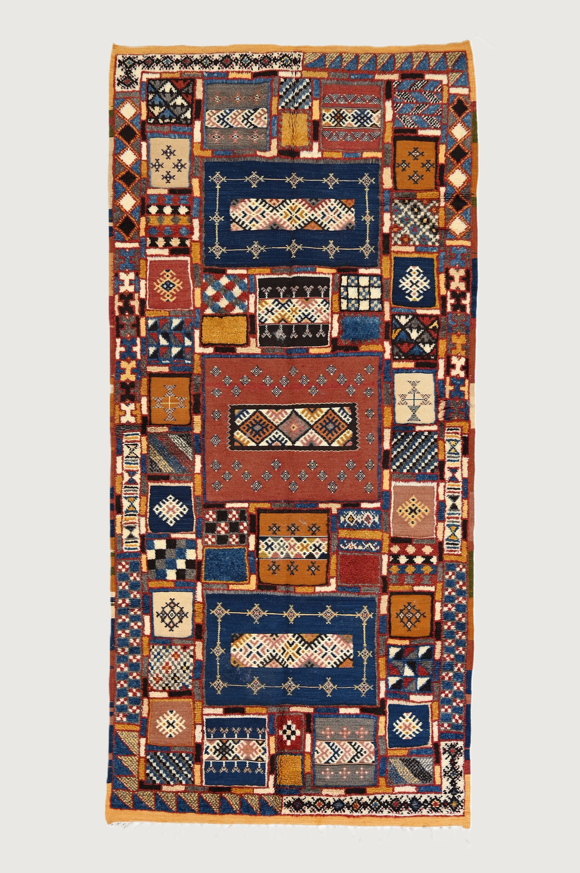 The Tapestry of Traditions Taznakht rug is a vibrant expression of Moroccan culture. Handwoven from 100% wool, it features a patchwork of geometric patterns in rich colors.