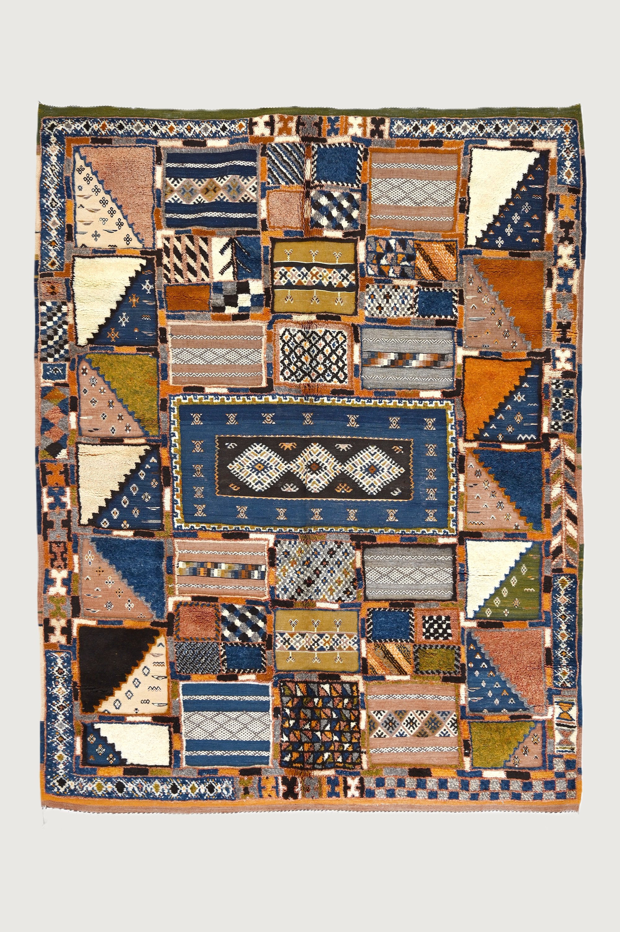 The Atlas Mosaic Patchwork Taznakht rug showcases a dynamic mix of colors and patterns inspired by Moroccan landscapes. Handwoven from wool, it reflects generations of craftsmanship.