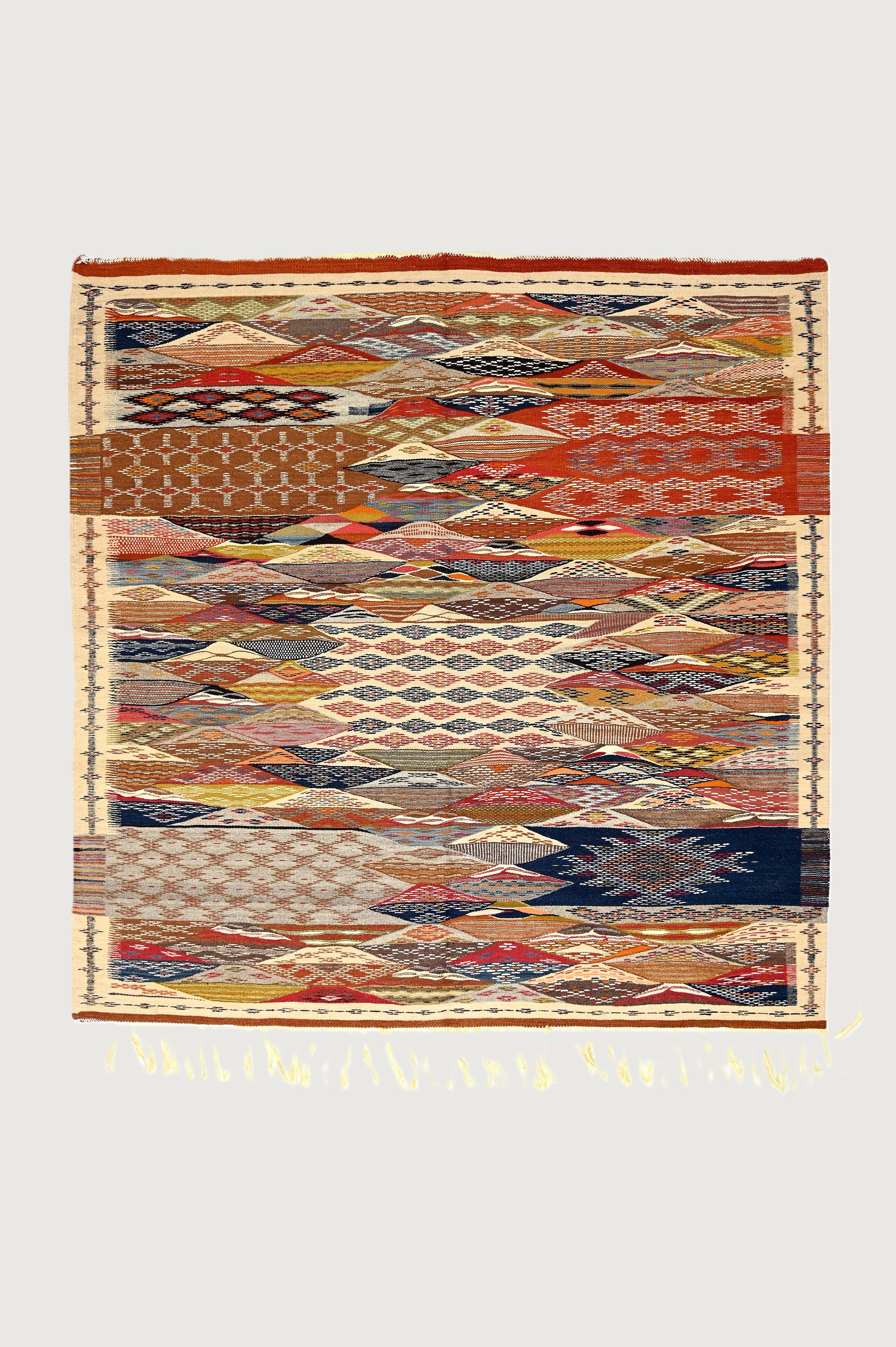 The Sunset Weave Abstract Taznakht rug reflects the warm tones of a Moroccan sunset through its abstract patterns and rich colors. Handwoven from wool, it blends tradition with modern expression.