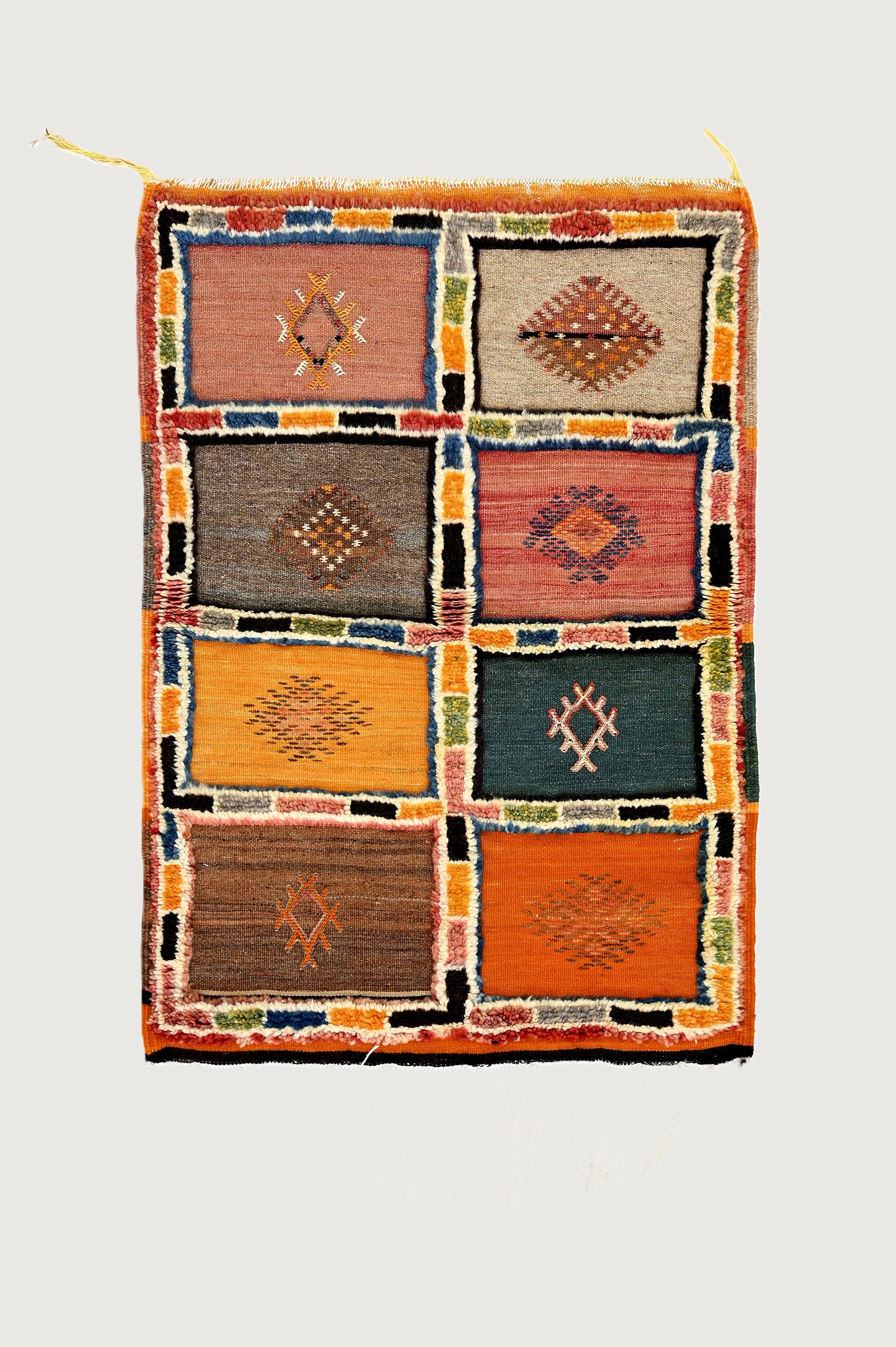 The Harvest Patchwork Handwoven Taznakht rug showcases warm earthy tones arranged in a patchwork of traditional motifs. Handwoven from wool, it reflects Moroccan heritage and craftsmanship.