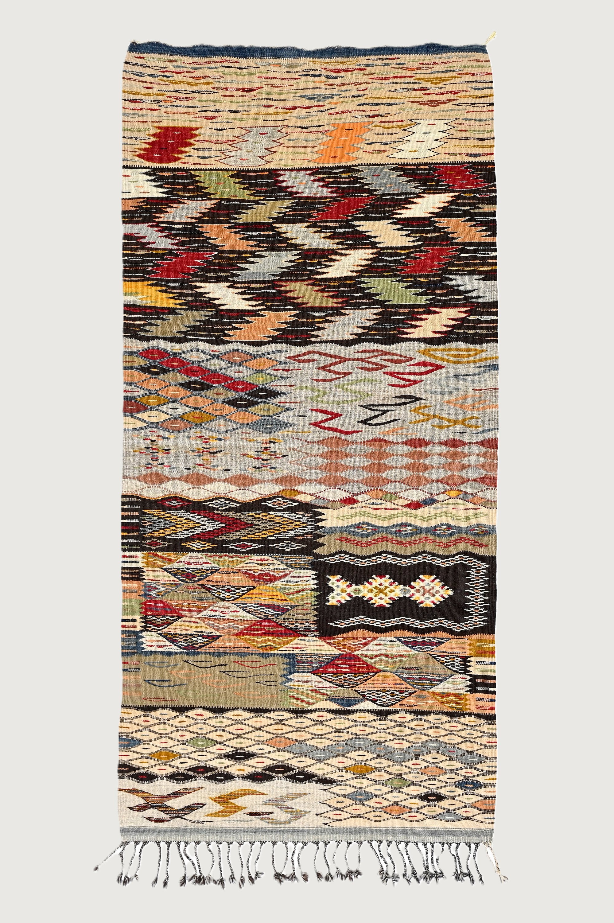 The Kaleidoscope Mirage Taznakht rug is a vibrant display of colors and geometric patterns. Handwoven from wool, it captures the dynamic beauty of Moroccan landscapes.