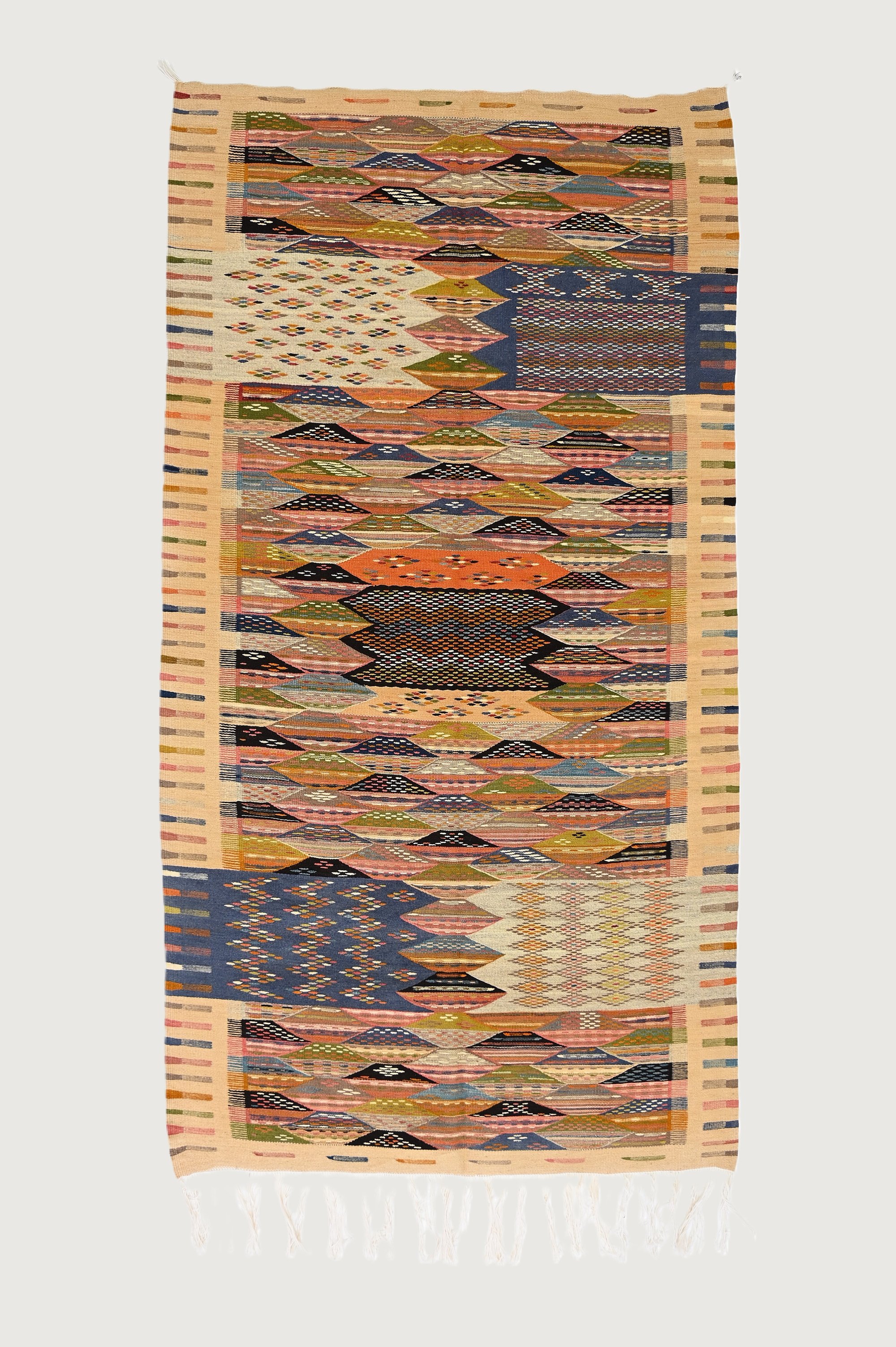 The Sunset Spectrum Woven Taznakht rug reflects the warm hues of a desert sunset through its geometric patterns. Handwoven from 100% wool, it blends tradition with vibrant color.