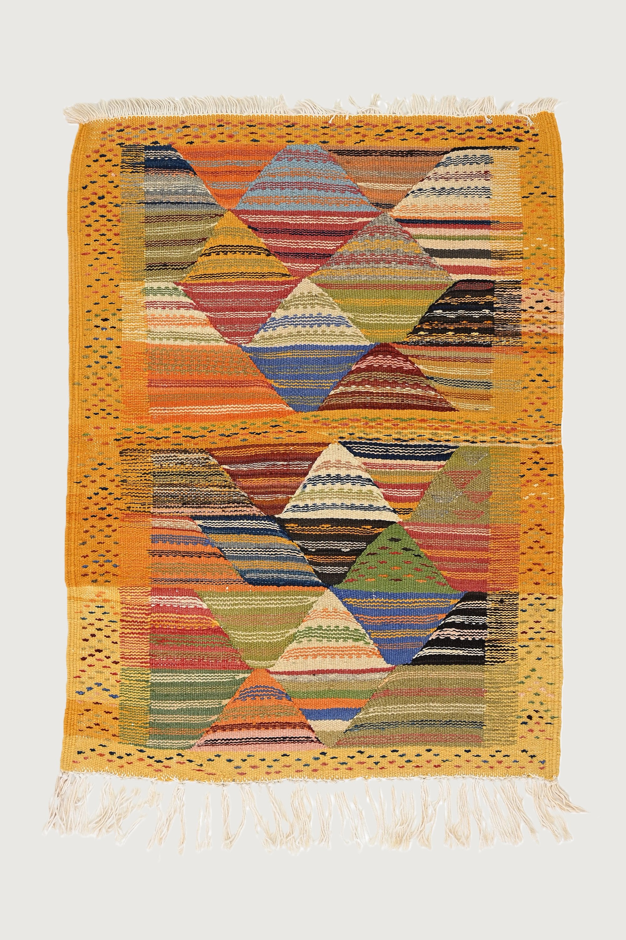 The Sunset Harmony Geometric Taznakht rug reflects the warm tones of dusk through its geometric patterns. Handwoven from wool, it combines tradition with modern elegance.