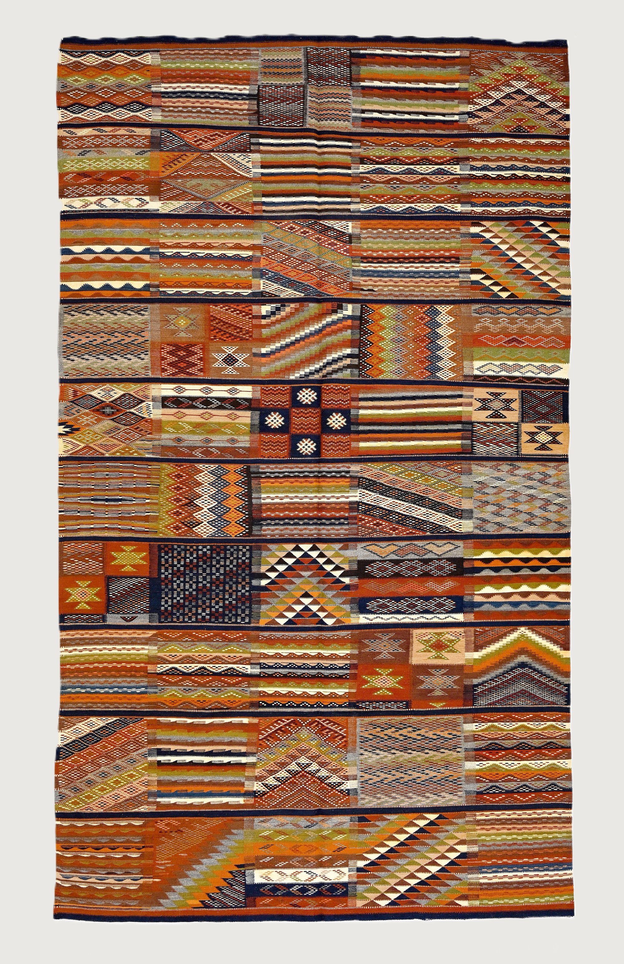 The Enigmatic Pathways Geometric Taznakht rug showcases complex patterns that create a dynamic visual effect. Handwoven from wool, it blends tradition with contemporary design.