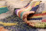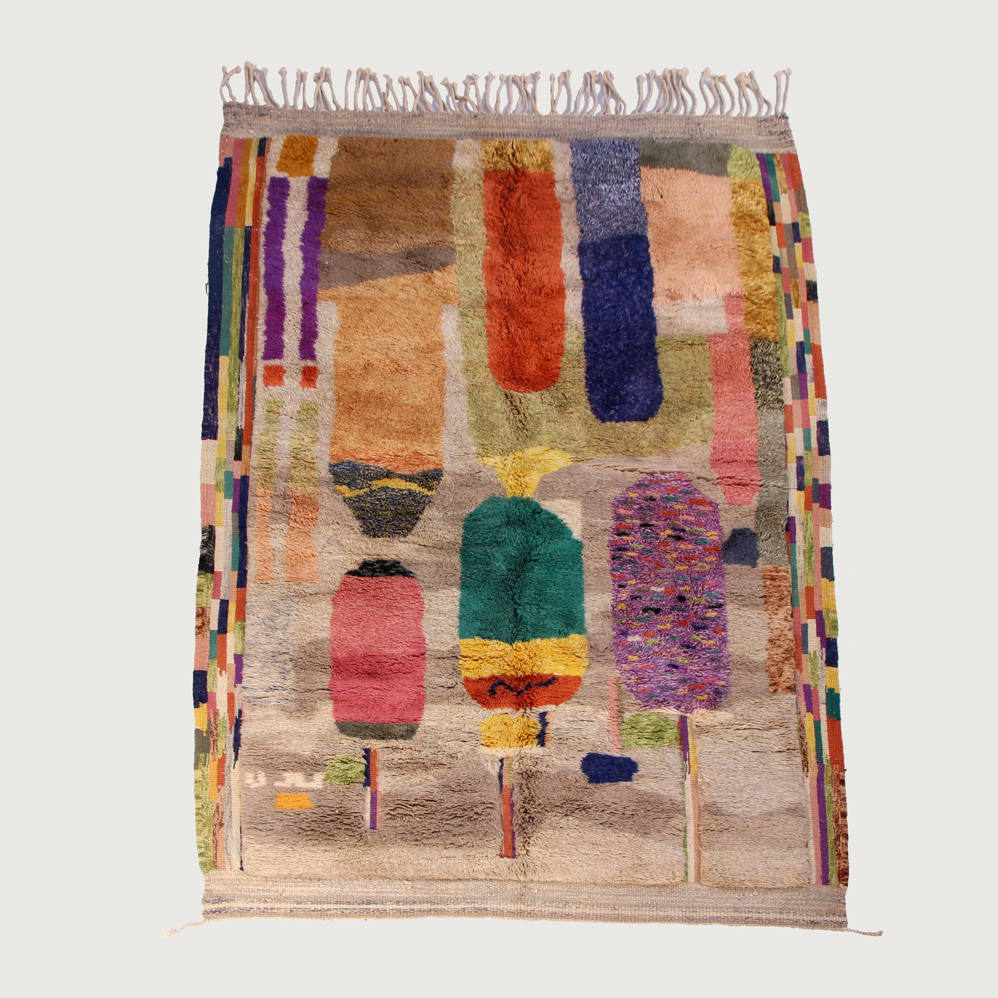 Handwoven in M’rirt in Morocco’s Middle Atlas Mountains, this exceptional Beni M’rirt rug features a vibrant composition inspired by stylized botanical forms. Textured vertical shapes in emerald, coral, saffron, indigo, blush, and lavender rise across a soft neutral field, framed by intricate multicolored borders.