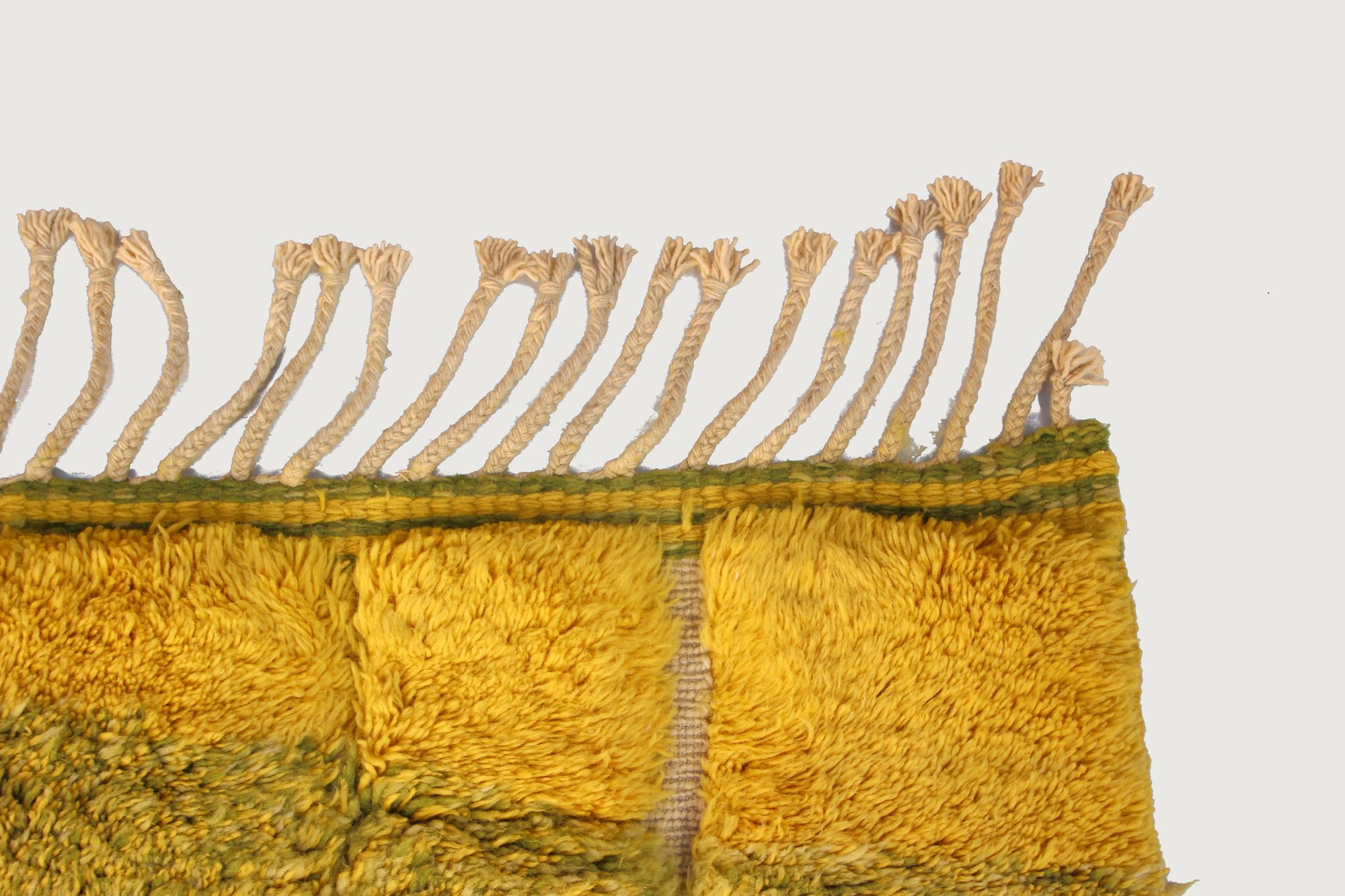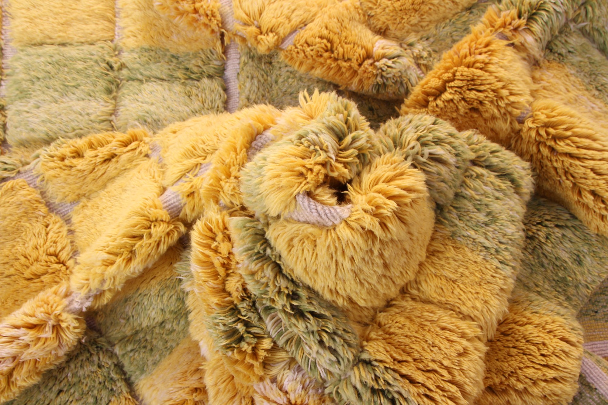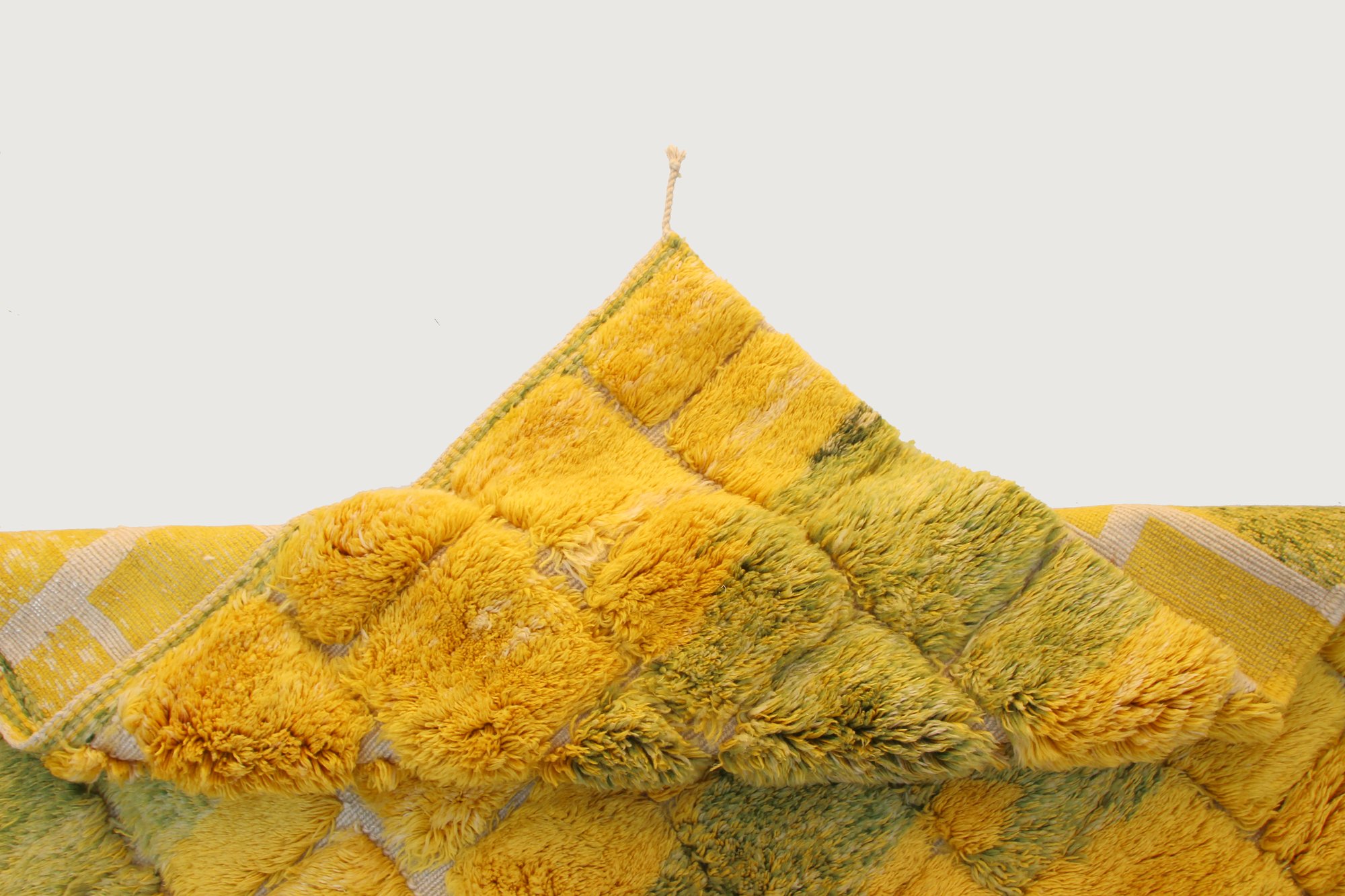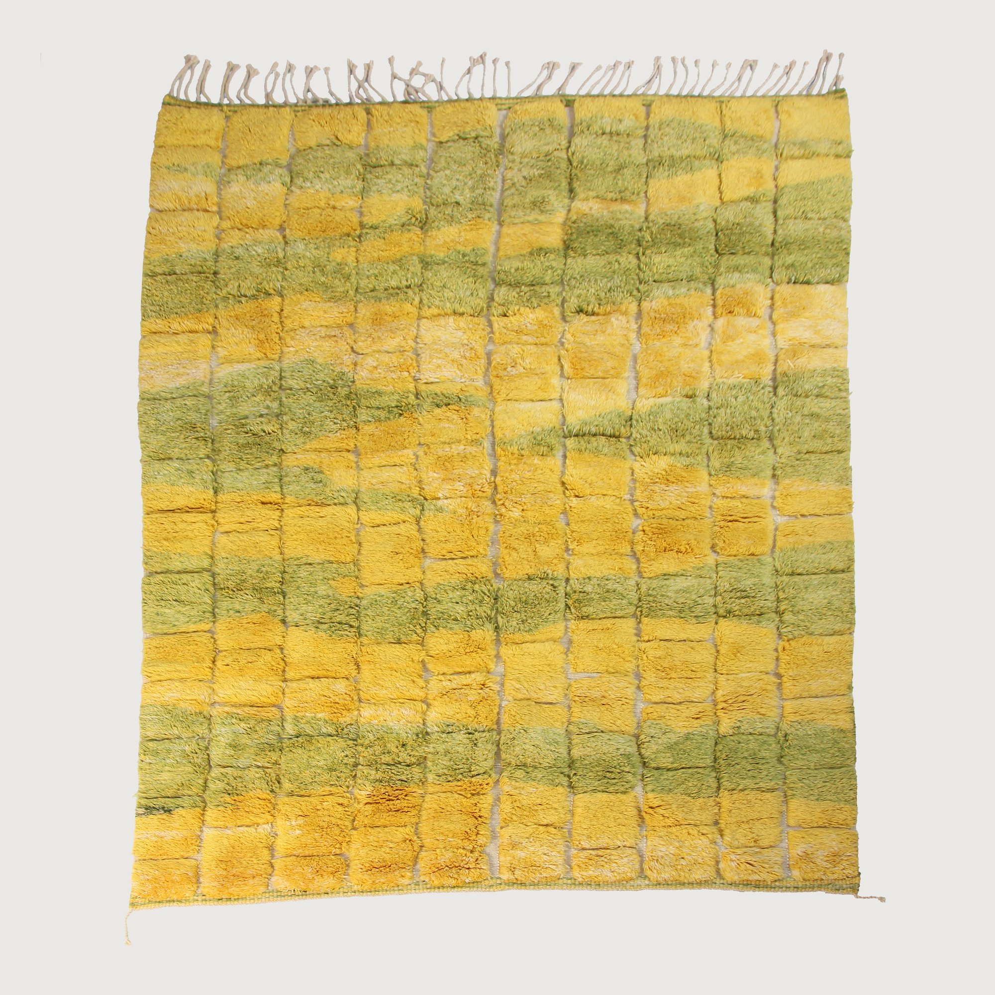 Handwoven in the Atlas Mountains of Morocco, this striking Beni M’rirt rug features a rhythmic grid of plush squares animated by flowing bands of golden yellow and soft olive green.