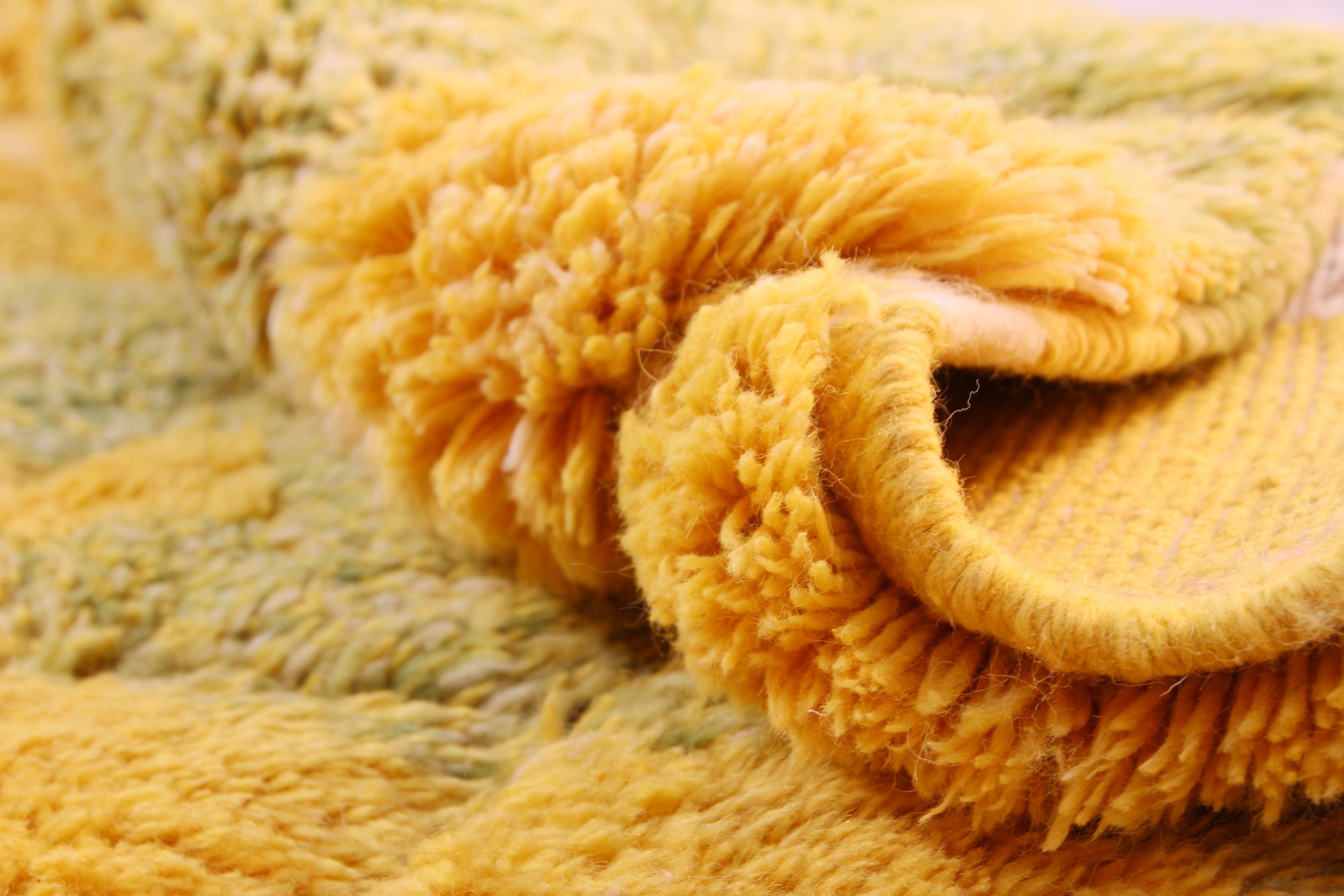 The structured geometric layout is softened by subtle tonal variation, creating movement and depth. Warm saffron hues and earthy greens evoke sunlit landscapes, while the sculpted high pile enhances its dimensional character.